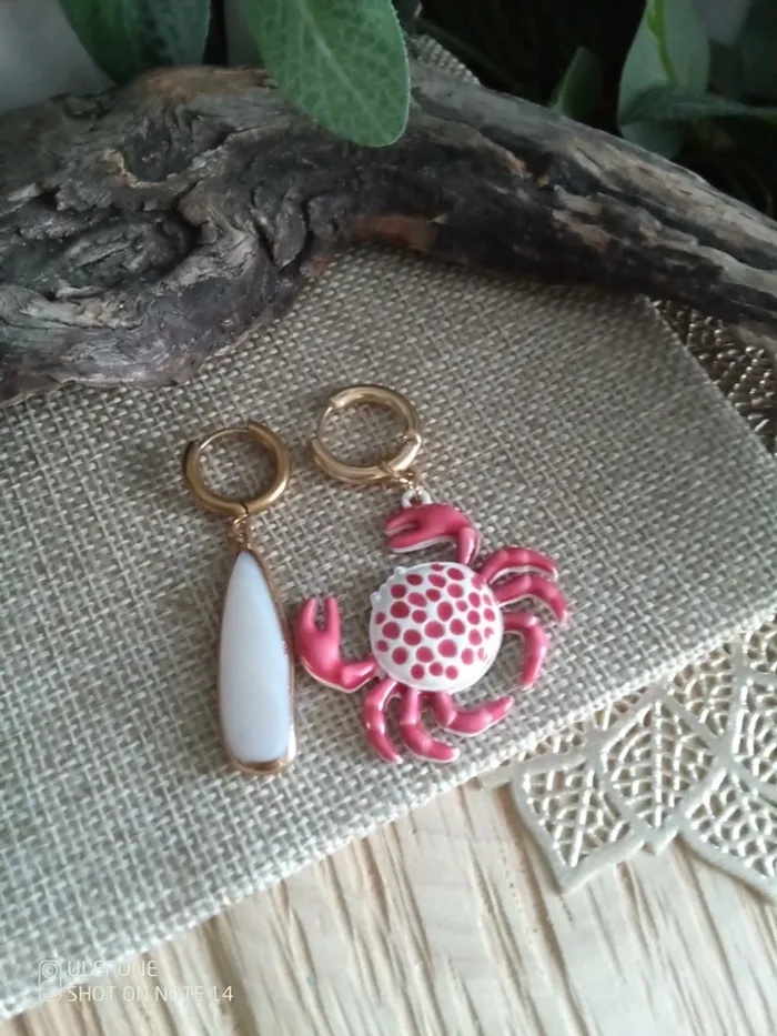 Boucles d'oreilles bohèmes asymétriques crabe et nacre - photo numéro 1
