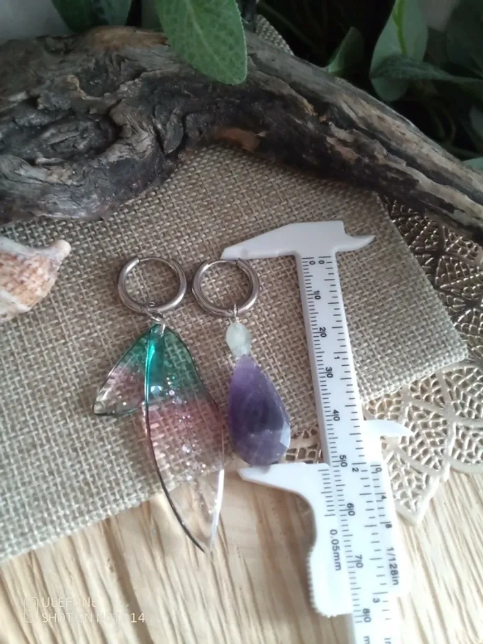 Boucles d'oreilles bohèmes asymétriques ailes et pierres améthyste et fluorine - photo numéro 2