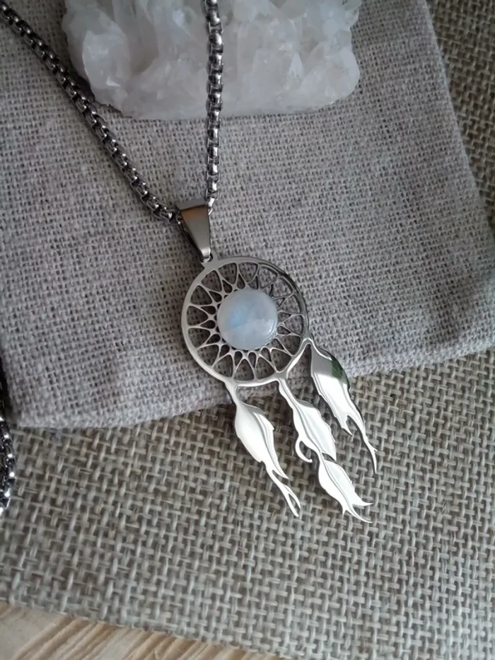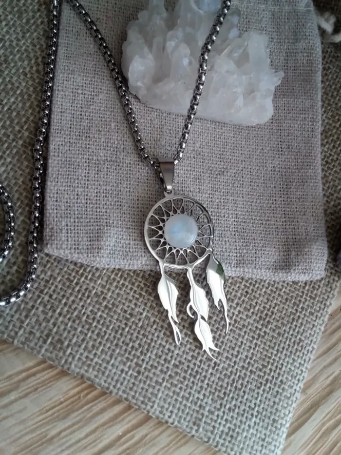 Collier attrape rêve en acier inoxydable argenté et pierre de lune naturelle