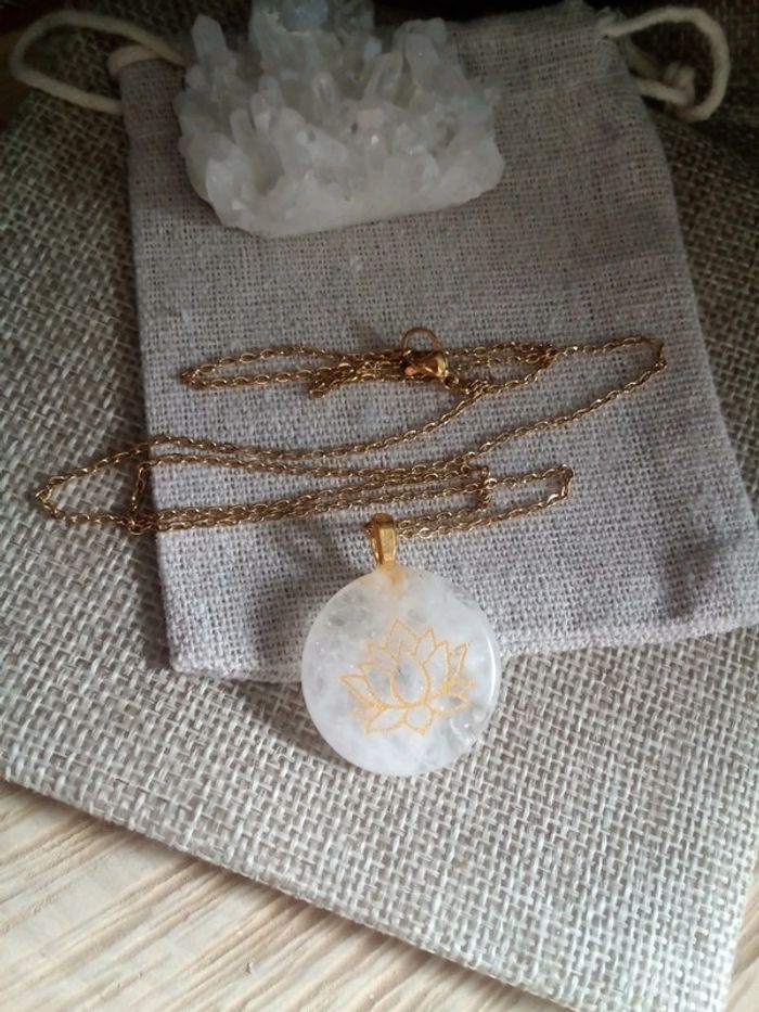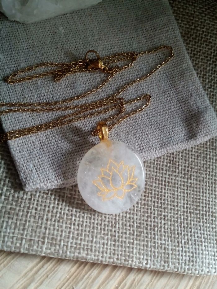 Collier pendentif en pierre de cristal de quartz avec gravure dorée d'une fleur de lotus - photo numéro 1