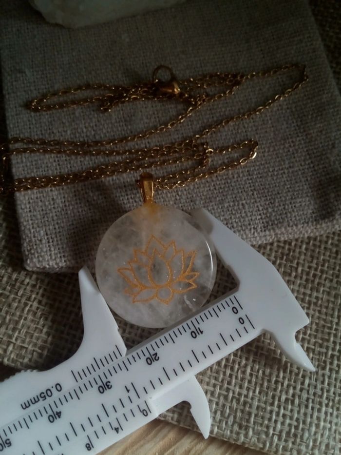 Collier pendentif en pierre de cristal de quartz avec gravure dorée d'une fleur de lotus - photo numéro 4