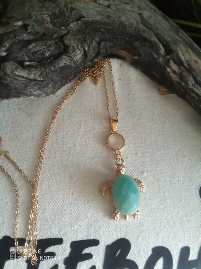 Collier long tortue en pierres d'amazonite et de nacre naturelles - photo numéro 1