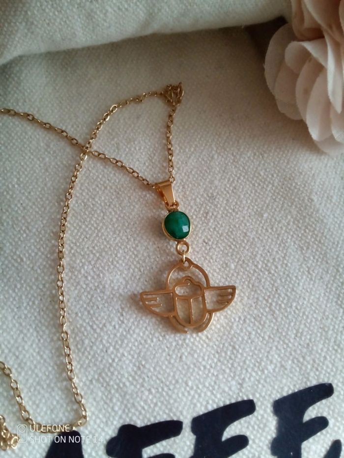 Collier pendentif scarabée et connecteur en véritable pierre naturelle d'émeraude brute sertie - photo numéro 1