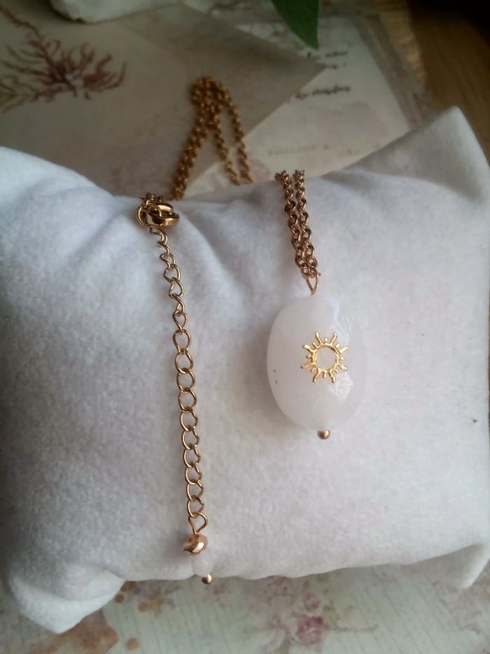 🌸🌸🩷🌸🌸 Chaîne en acier inoxydable plaqué doré 44 cm et 5 cm d'extension avec pierre de lune Pendentif en pierre naturelle de jade blanc avec un soleil doré Pièce unique Lithothérapie Voir aussi bola bohème cadeau chi professeur joyeux vaccins spirituel stone necklace scarabé talisman ésotérisme jade amulette porte bonheur pendule planche radiesthésie dogna camomille TomTom