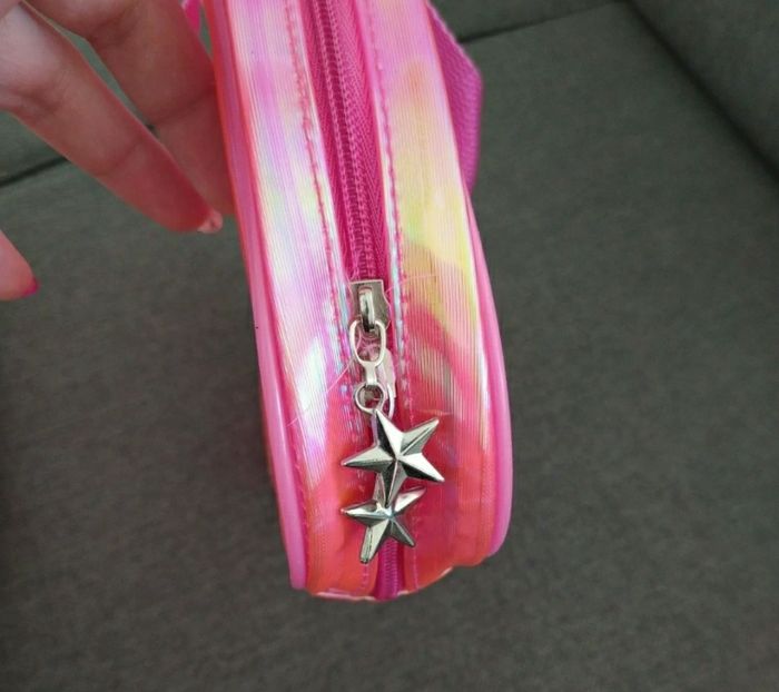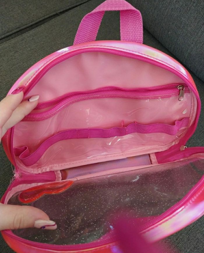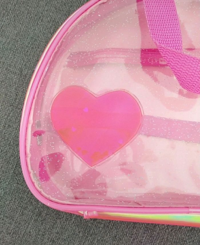 Sac rose flash. Transparent à l'avant avec un coeur et paillettes. Très mimi