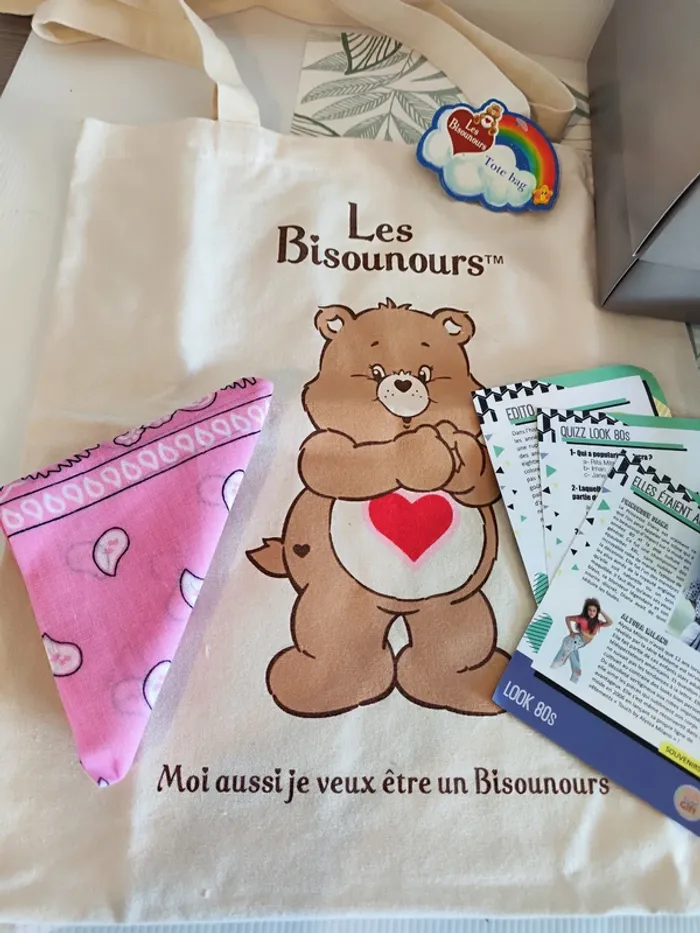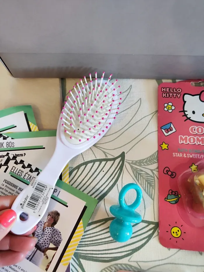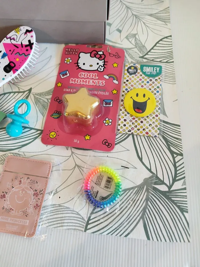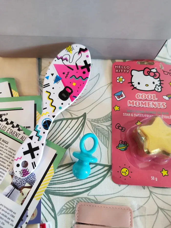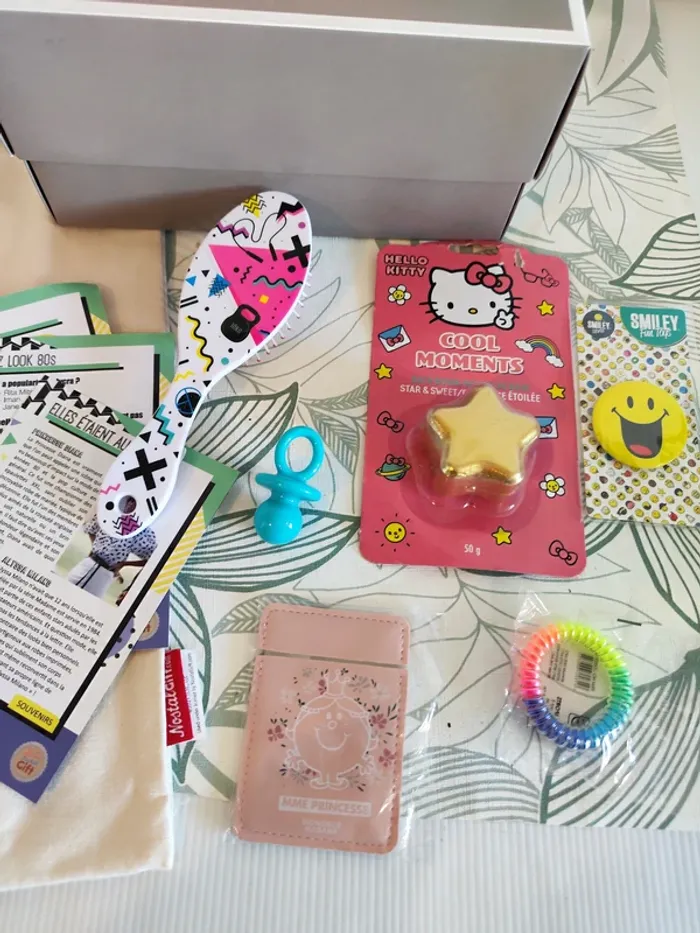 Coffret cadeau mode des années 80/90, 1 bombe de bain Hello Kitty, 1 tote bag Bisounours, 1 bandana rose, 1 brosse à cheveu 80s, 1 élastique / bracelet ressort arc-en-ciel, 1 badge smiley, 1 miroir de poche Monsieur madame Mme princesse, 1 totoche géante bleue valeur du lot 36,90€ (svm12)