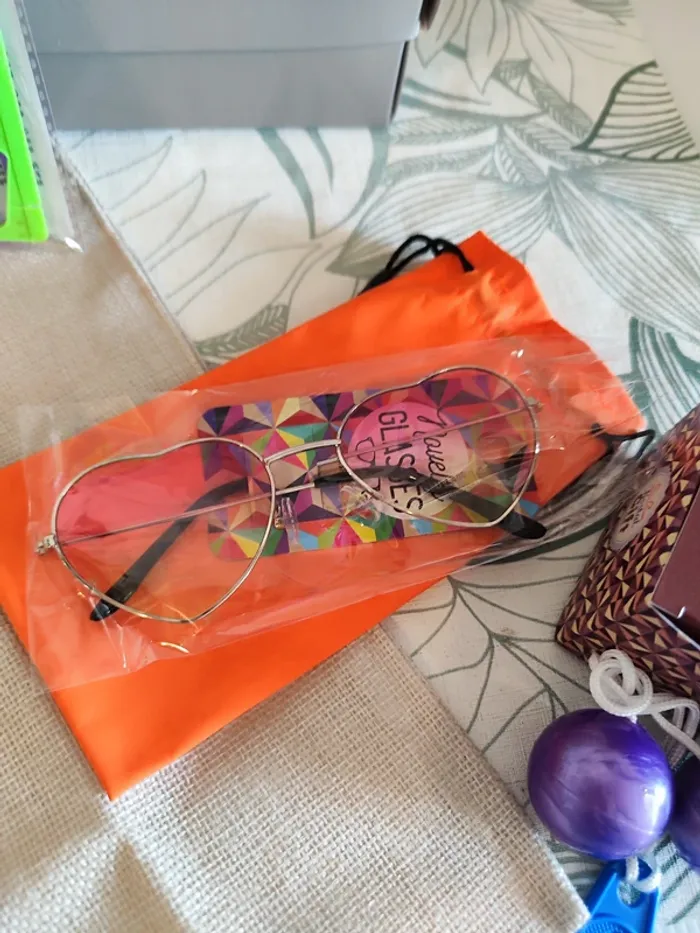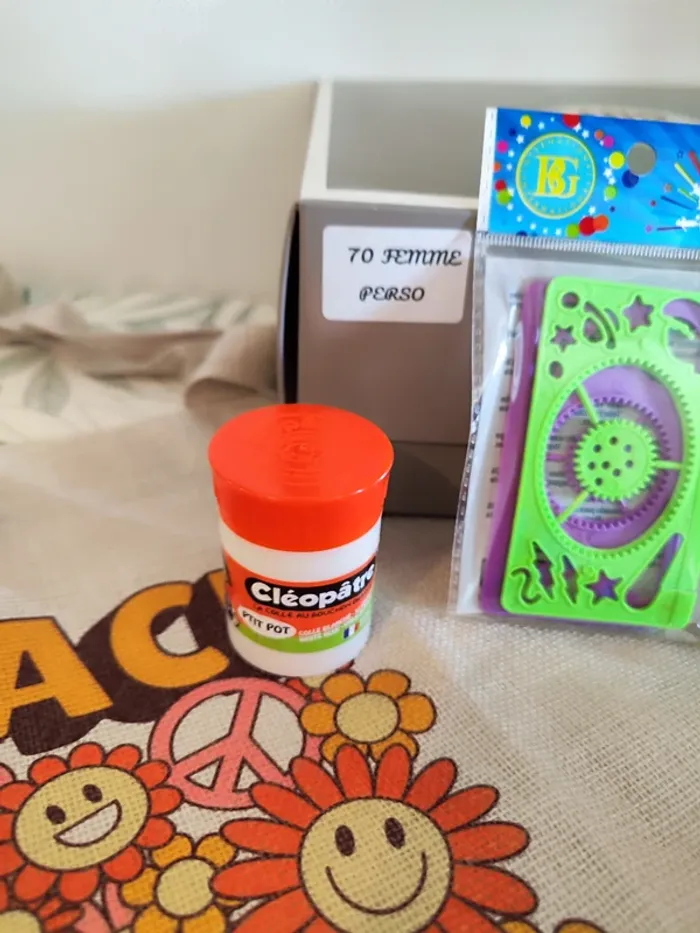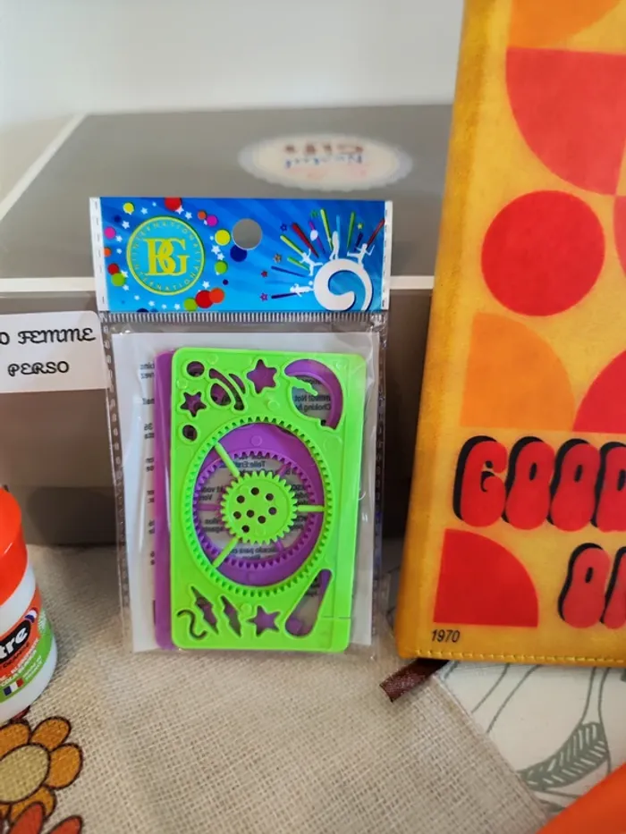 Coffret cadeau "Génération 70 femme" contenant 6 cadeaux : Un carnet A5 couverture simili cuir "Good vibes only", une paire de lunette armature métal en forme de coeur (verre rose), un pot de colle cléopâtre (50g), un tote bag peace and love 40*37cm, un jeu de tac-tac, un set de mini spirographe, valeur 35€ (svm126)