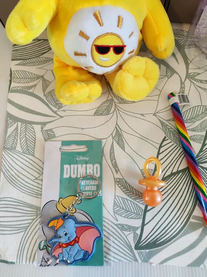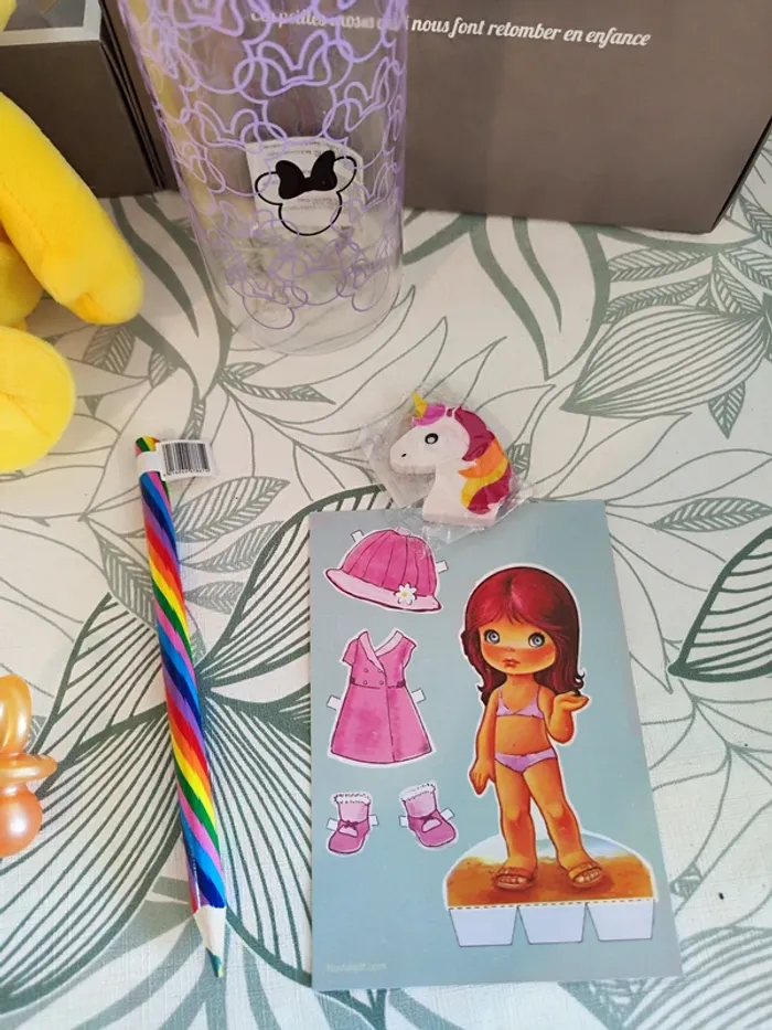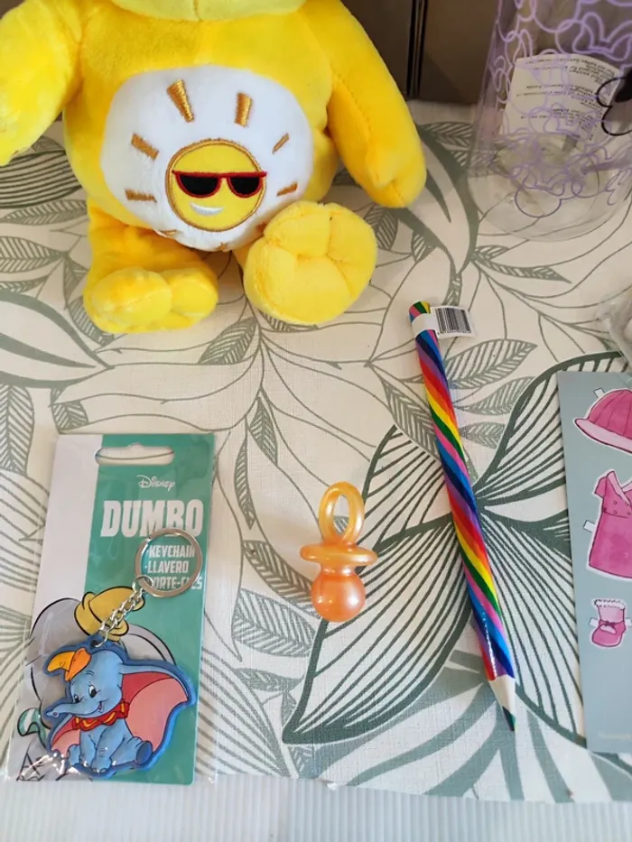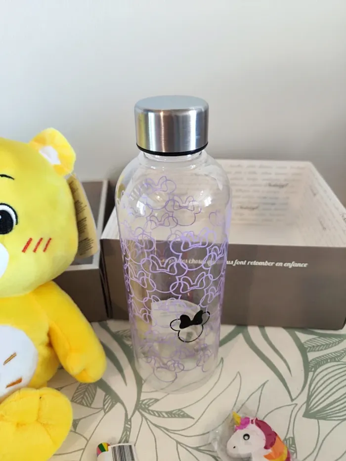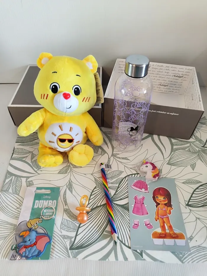 Coffret cadeau " Trop mignon" femme contenant 7 cadeaux, Une bouteille d'eau Minnie 850ml( sous licence officielle), une peluche Bisounours 21cm (version 2019) couleur jaune , un porte clef Dumbo de disney (officiel), une gomme licorne, un crayon mine de 4 couleurs, une carte postale " Poupée en papier habiller" un porte clé totoche (coloris aléatoire) valeur du lot 39,90€ (svm32)