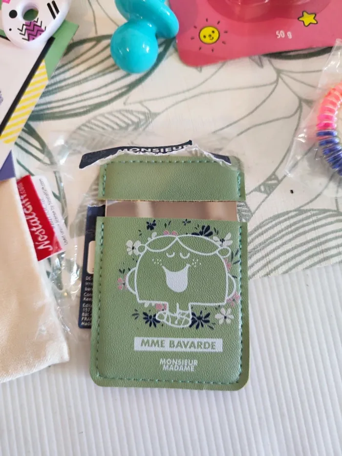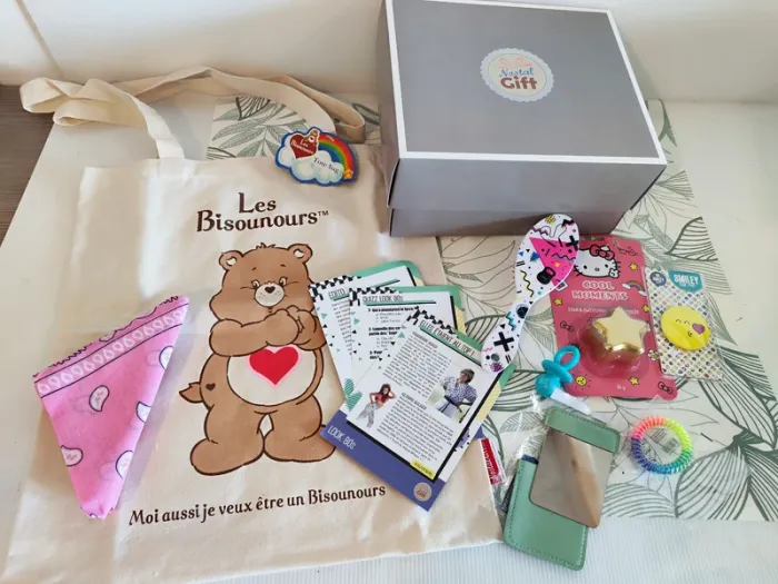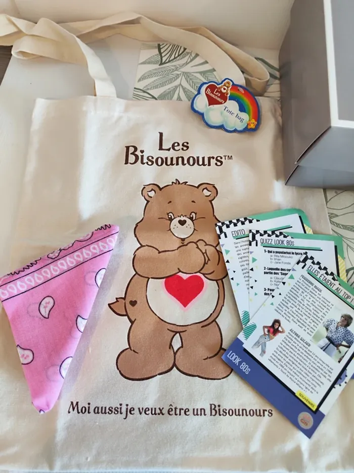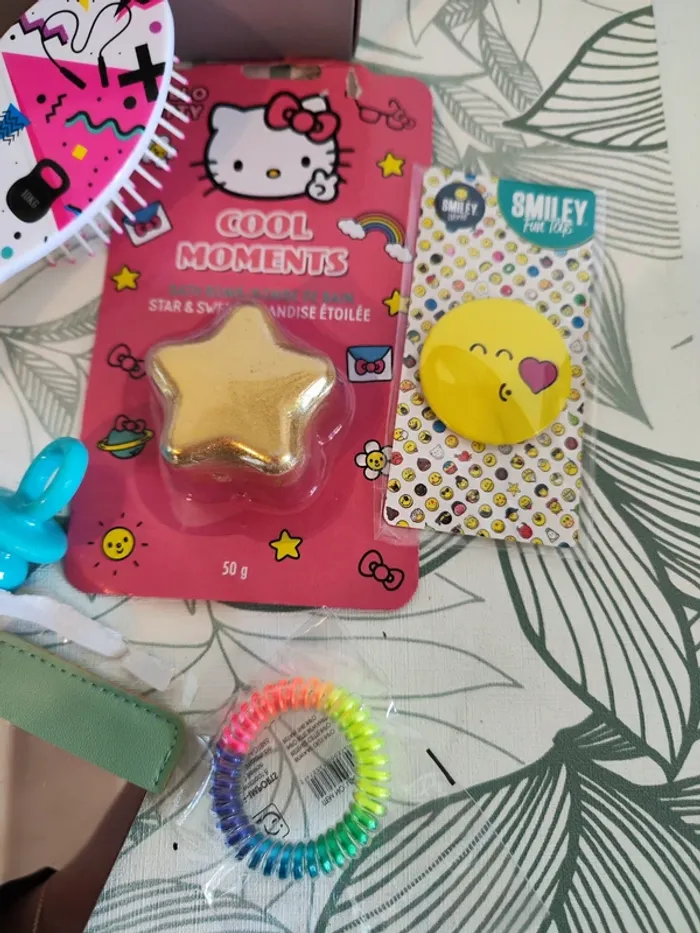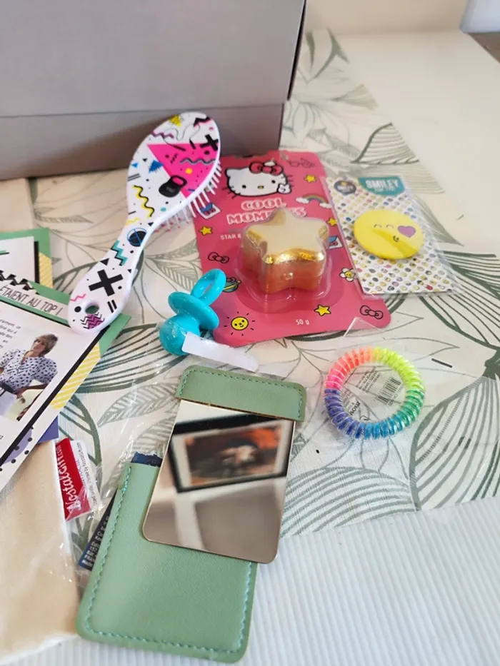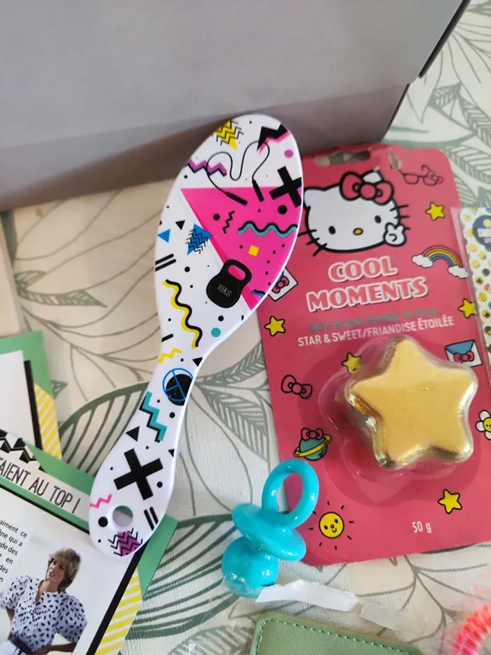 Coffret cadeau mode des années 80/90, 1 bombe de bain Hello Kitty, 1 tote bag bisounours, 1 bandana rose, 1 brosse à cheveu 80s, 1 élastique / bracelet ressort arc-en-ciel, 1 badge smiley, 1 miroir de poche Monsieur madame , 1 totoche géante bleue, valeur du lot 36,90 € (svm9)