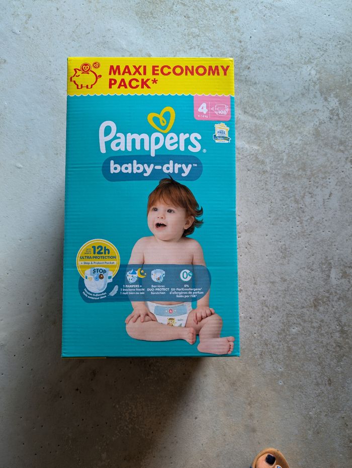 1 paquet de 108 couches Pampers taille 4 (9-14 kg). Neuf, non ouvert.