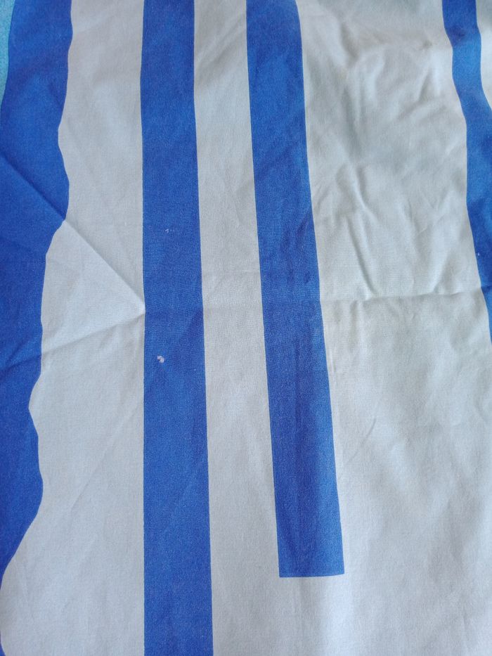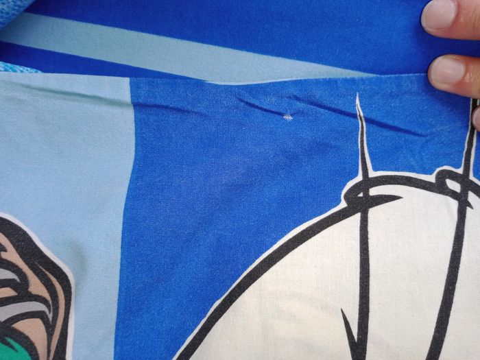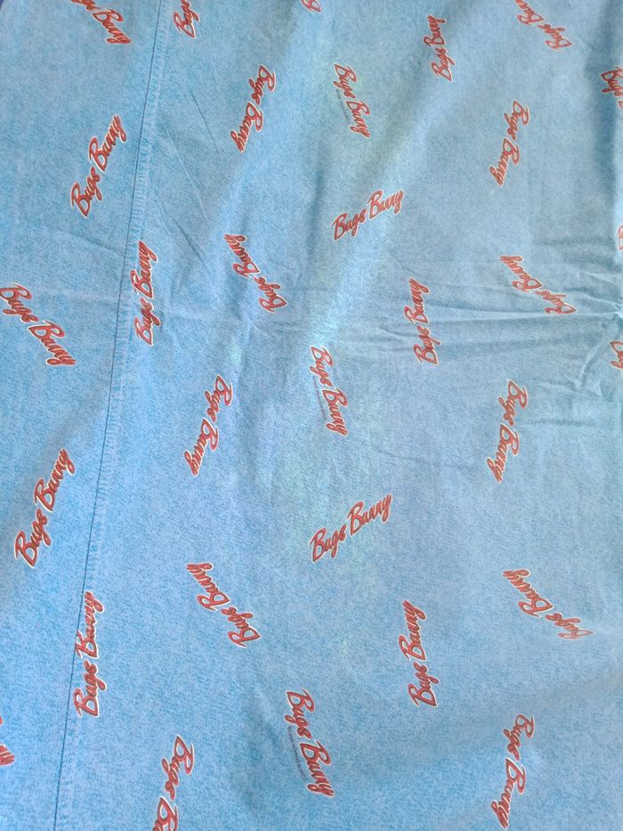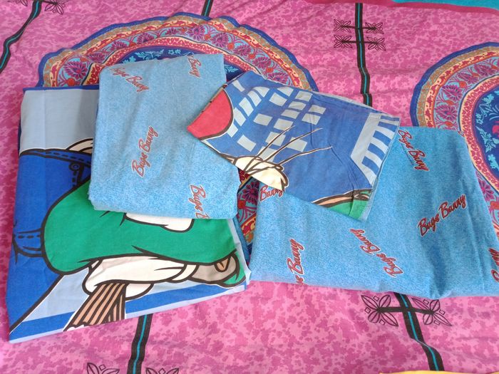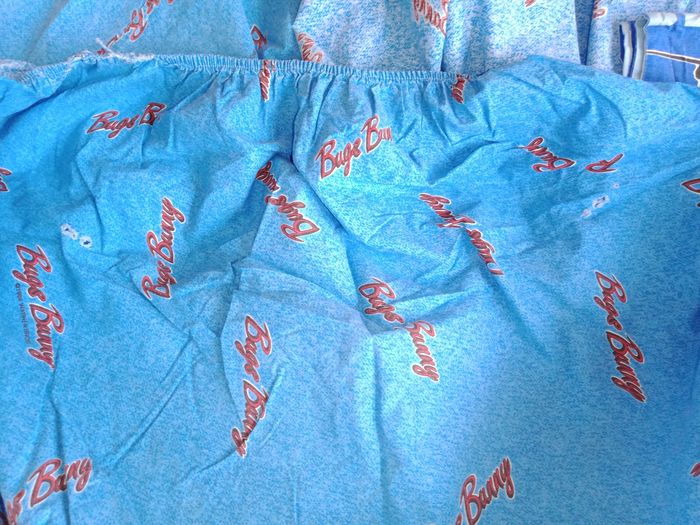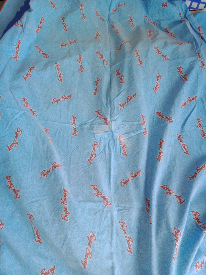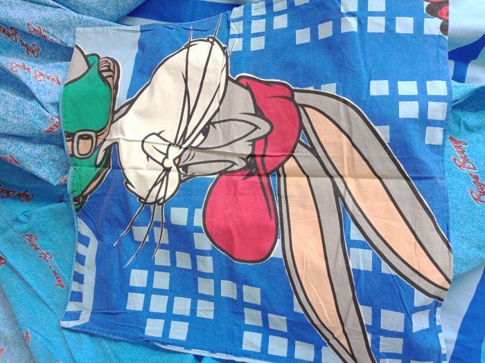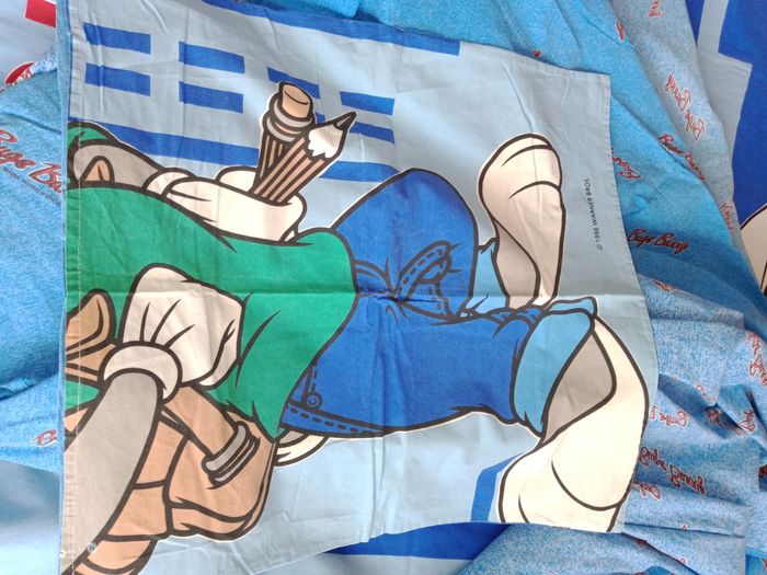 Parure 1 personne housse de couette, drap housse, drap plat et taie d'oreiller Bugs bunny * 1 drap plat décoloré au niveau du plie (rebord) mais possible de mettre au niveau des pieds 190 x 290 environ * 1 drap housse 90 x 190 + 20 cm de bord * 1 taie environ 60 x 60 cm * 1 housse de couette avec des petits accros dont 1 sur le plie au bout qui va sous le matelas Et les autres quelques petits défauts ( léger trous) Et ou un peu décoloré