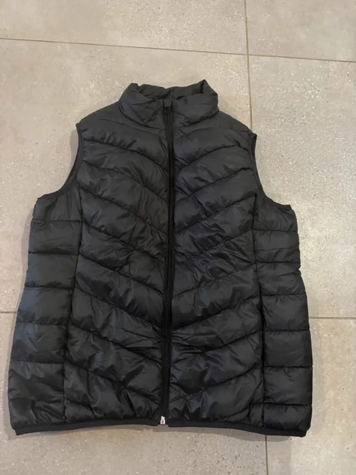 Doudoune sans manche noir, taille L, bon état mais il y a deux marques