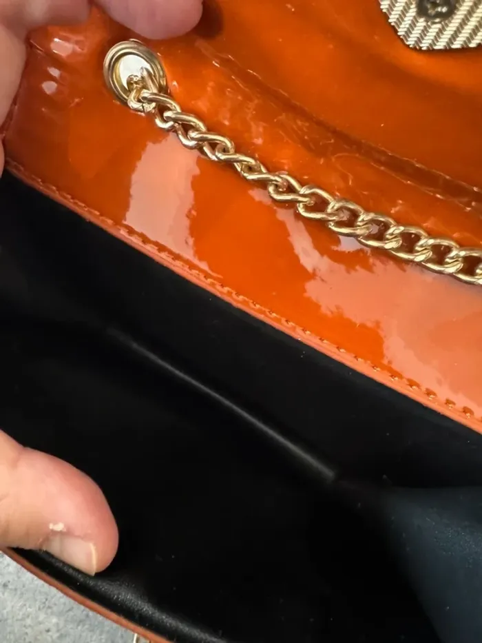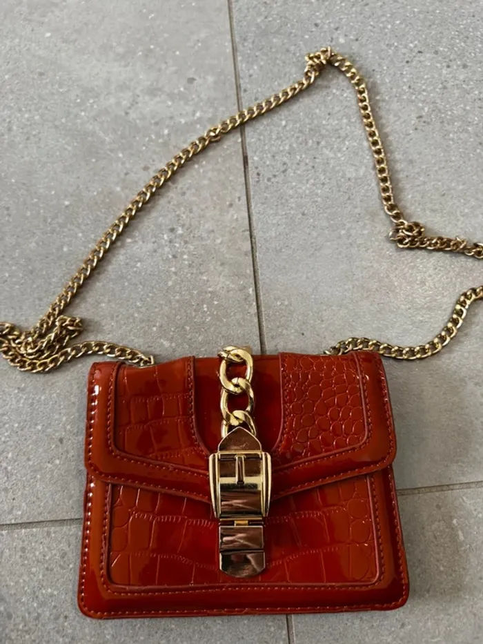Sac à bandoulière marron, bon état juste quelques traces d'usures sur le doré à l'avant, 18x12cm