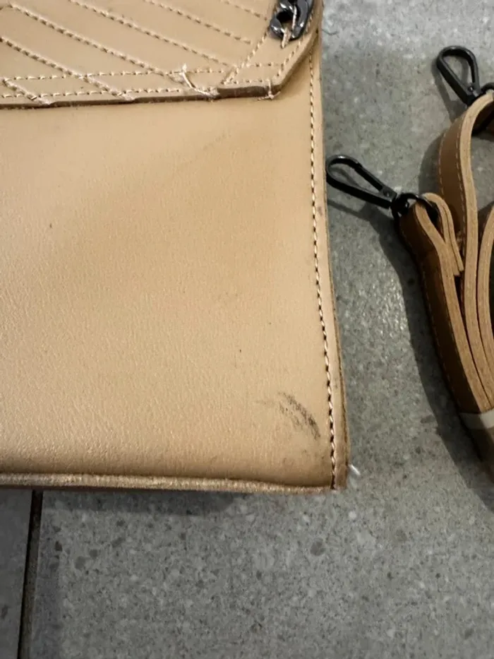 Sac à bandoulière marron, bon état mais quelques traces à l'arrière, 21x14cm