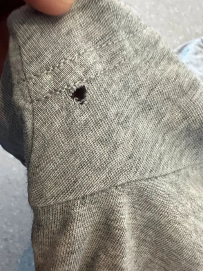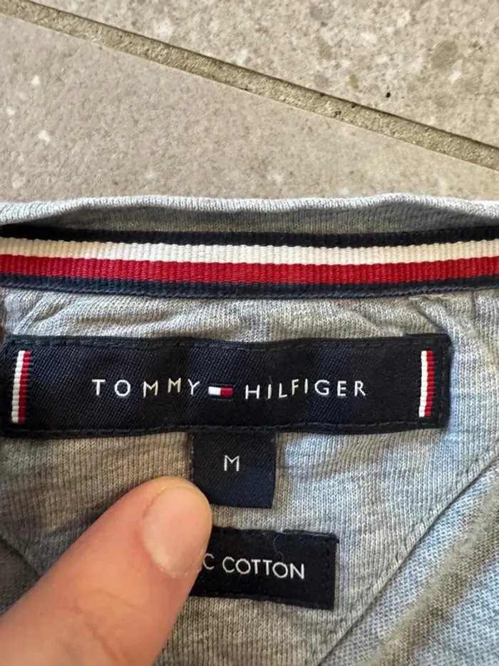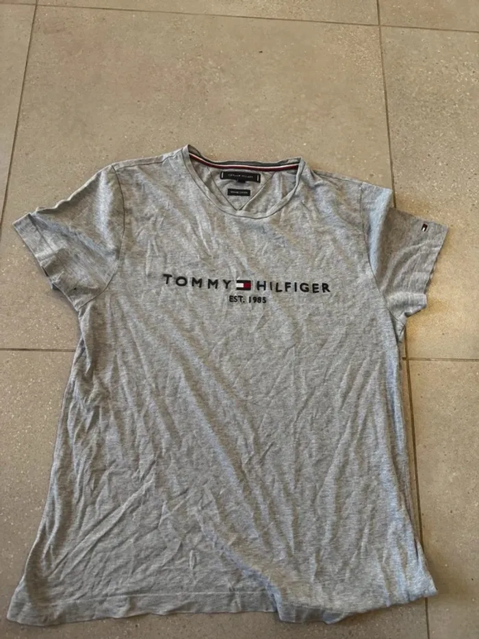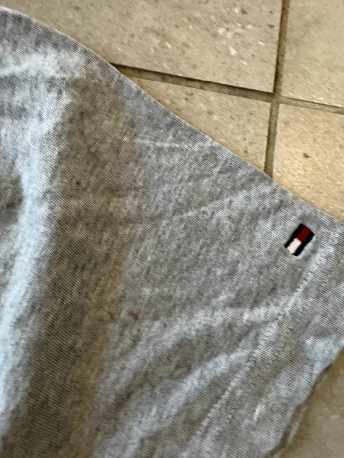 T-shirt gris Tommy Hilfiger, taille M, bon état mais un petit trou sous une aisselle