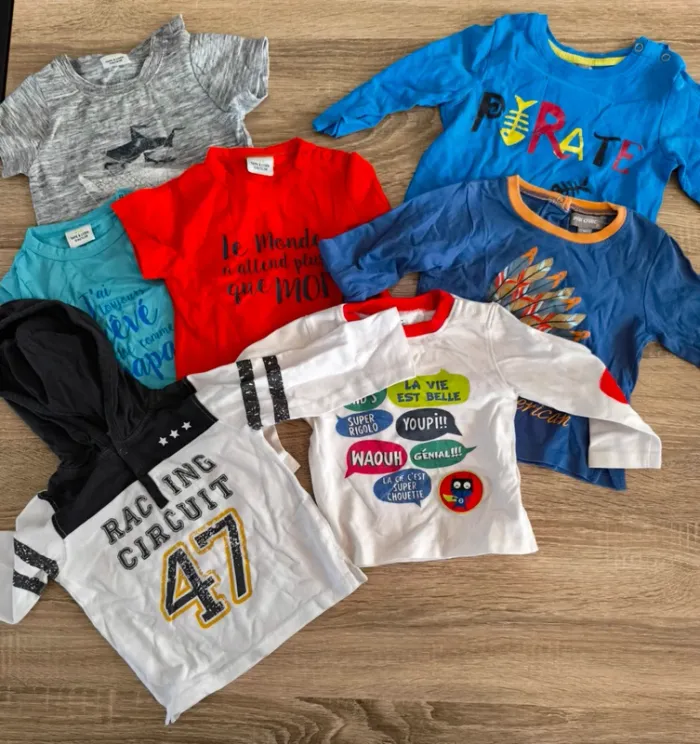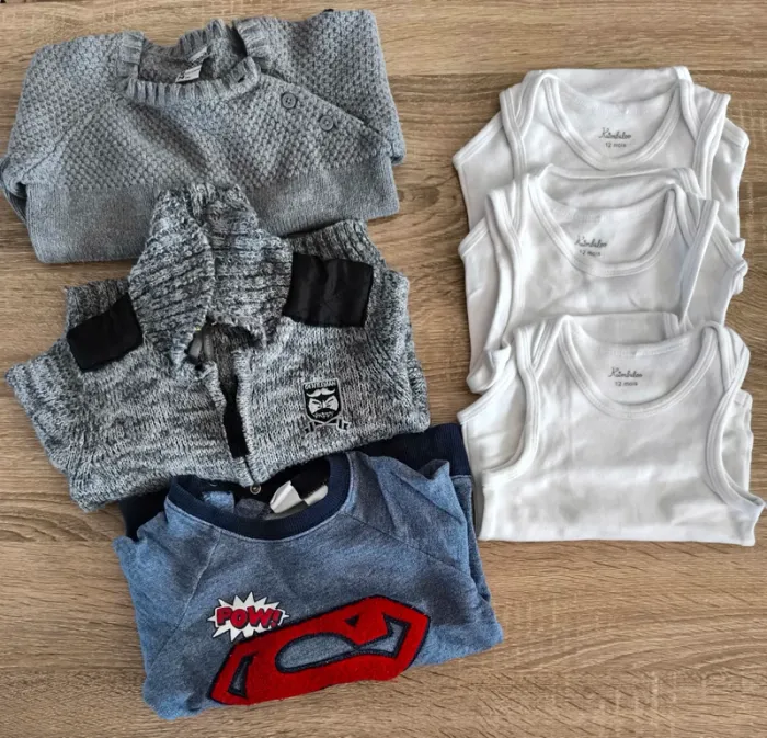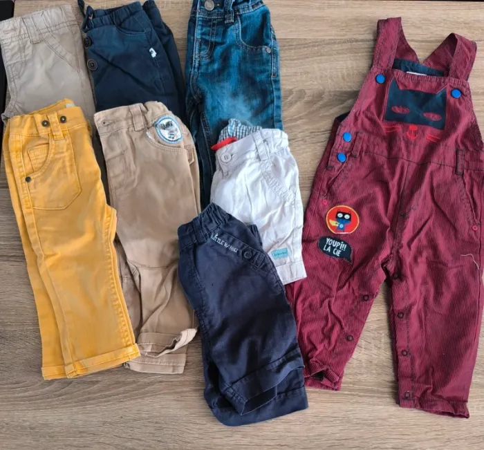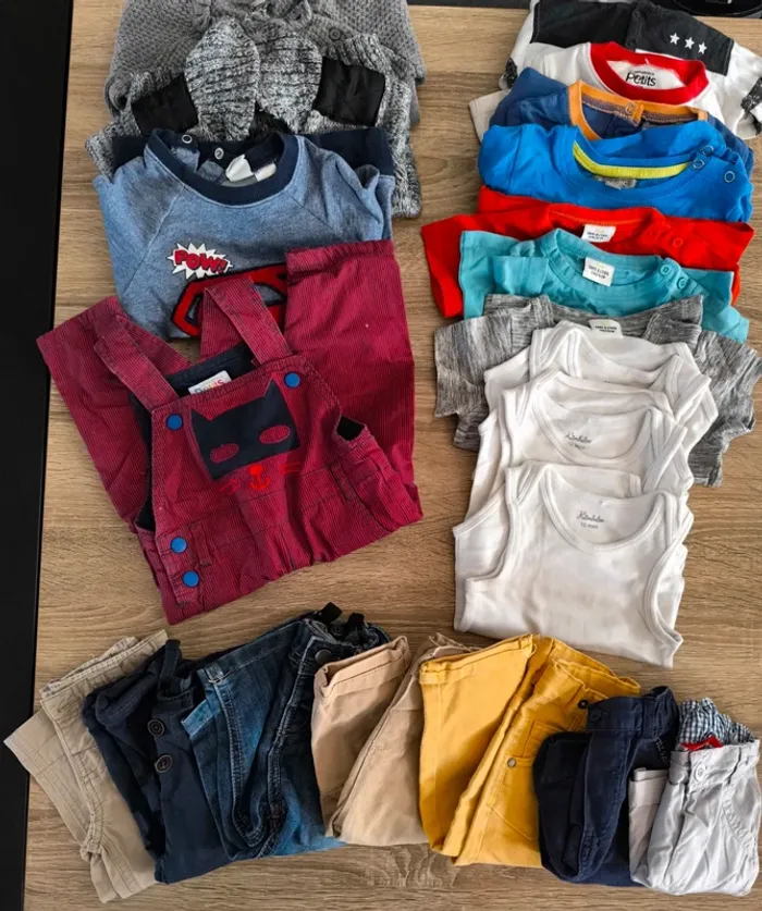 - 3 bodys sans manches - 2 pulls - 1 gilets - 1 salopette - 5 pantalons - 2 shorts - 4 t-shirts manches longues - 3 t-shirts manches courtes