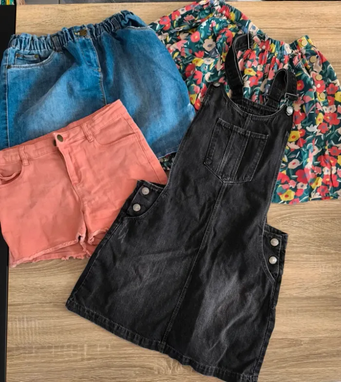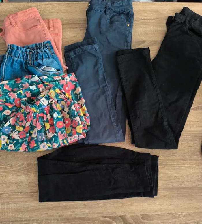 - 2 pantalons skinny TAO - 1 legging PRIMARK - 2 jupes TAO - 1 short TAO - 1 jupe salopette KIABI