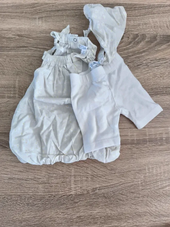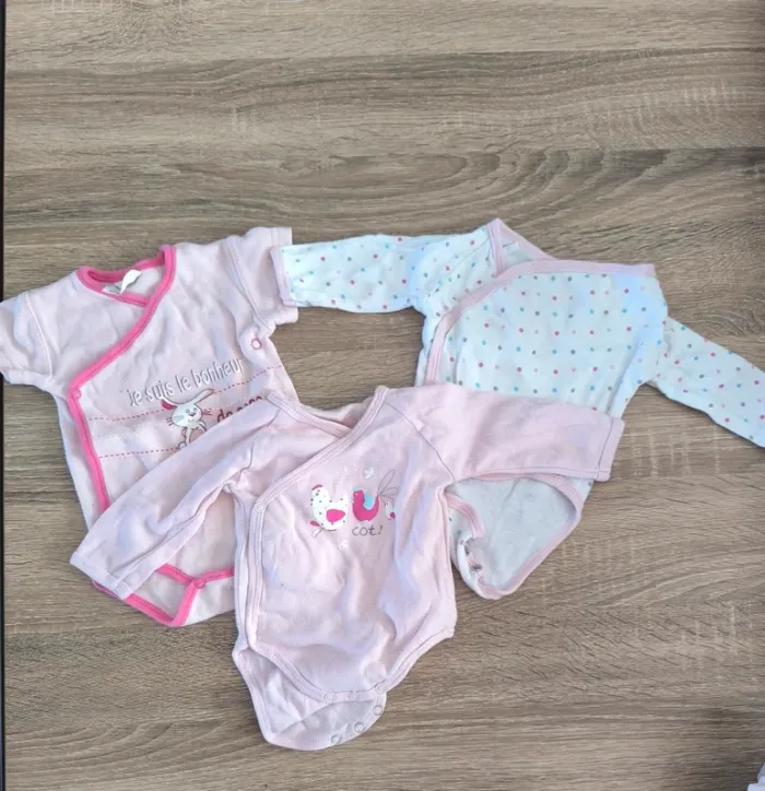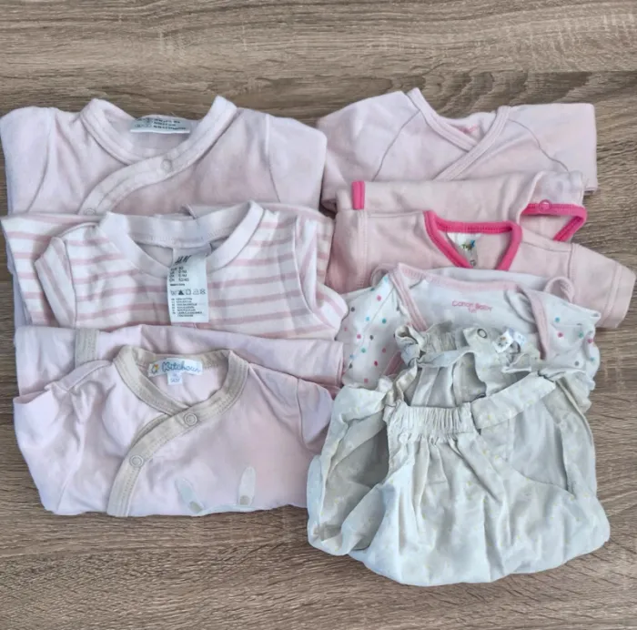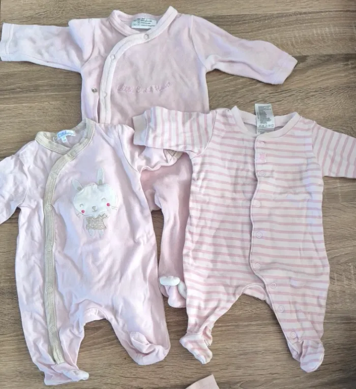- 2 bodys manches longues - 1 body manches courtes - 2 pyjamas léger - 1 pyjama épais - 1 ensemble robe/legging/fichu