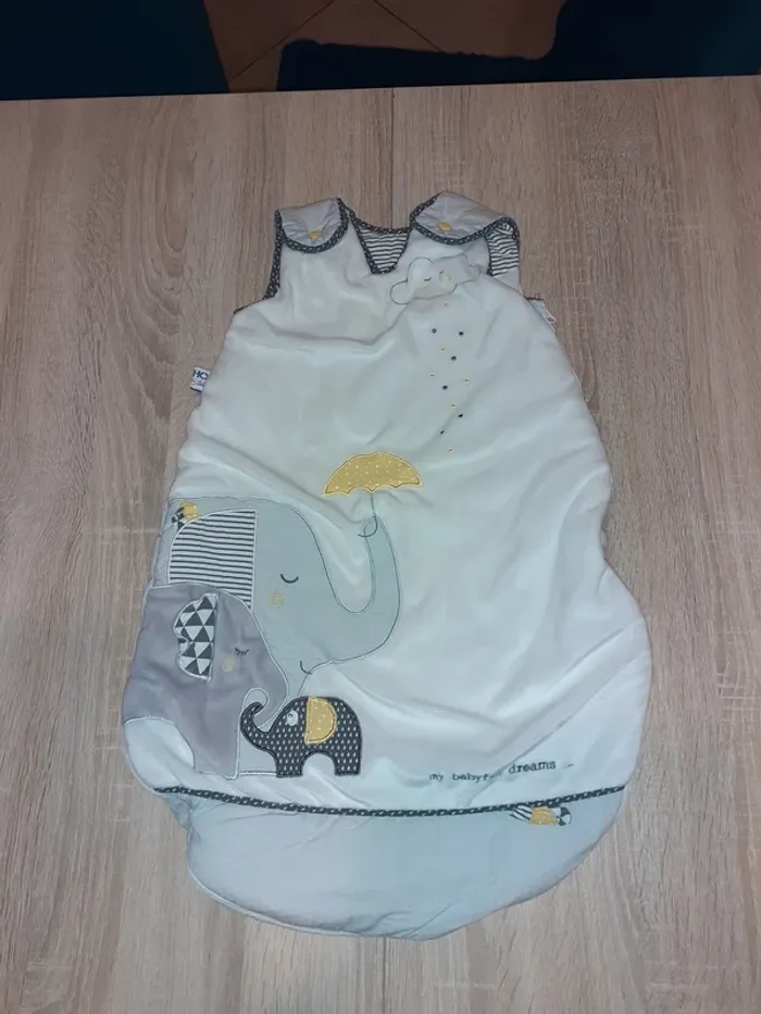 Gigoteuse hiver blanc et gris, très chaude avec motif éléphants S'ouvre sur le côté, de haut en bas. Taille 0-6 mois Très bon état