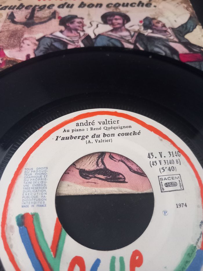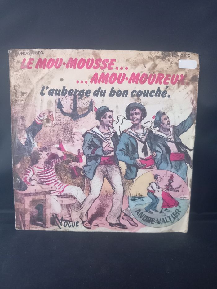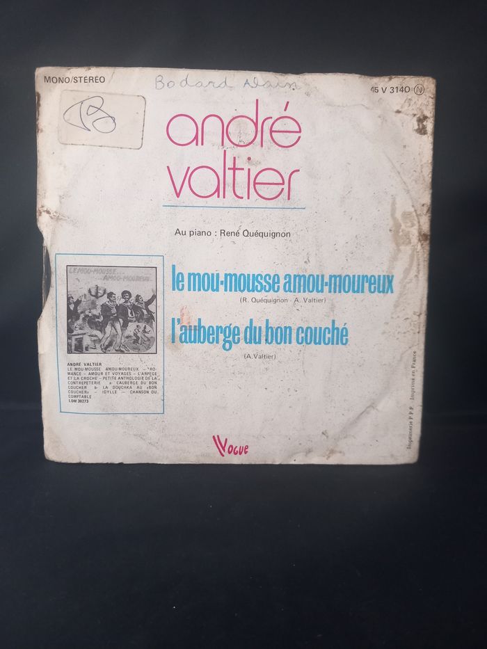 Disque vinyle 45 tours Artiste : André Valtier Face A : Le mou mousse amou amoureux Face B : L'auberge du bon couché En bon état juste la pochette abîmer voir photos