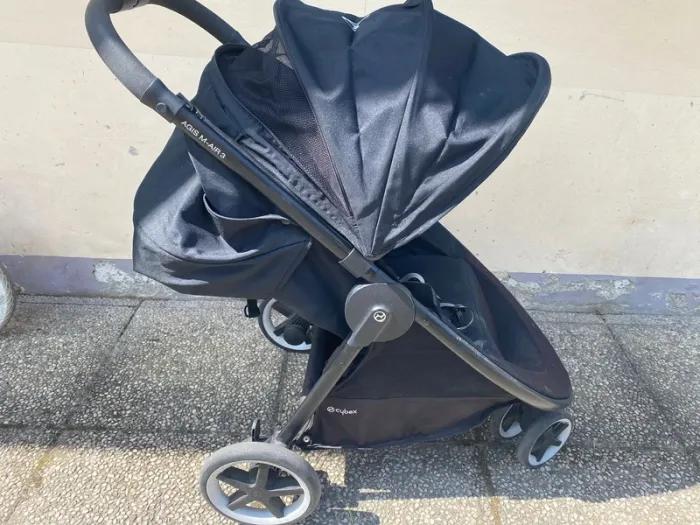 Poussette légère Cybex Agis M-Air 3, noire. Facile à manœuvrer, elle se plie rapidement d'une seule main et dispose d'un panier spacieux. D'occasion, elle présente des signes d'usure normaux, mais est en parfait état de fonctionnement. Idéale pour ceux qui recherchent une poussette pratique et durable.