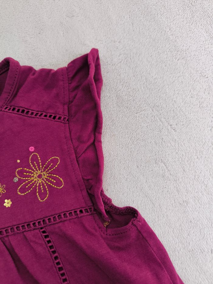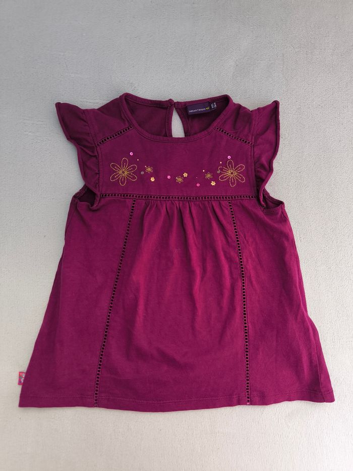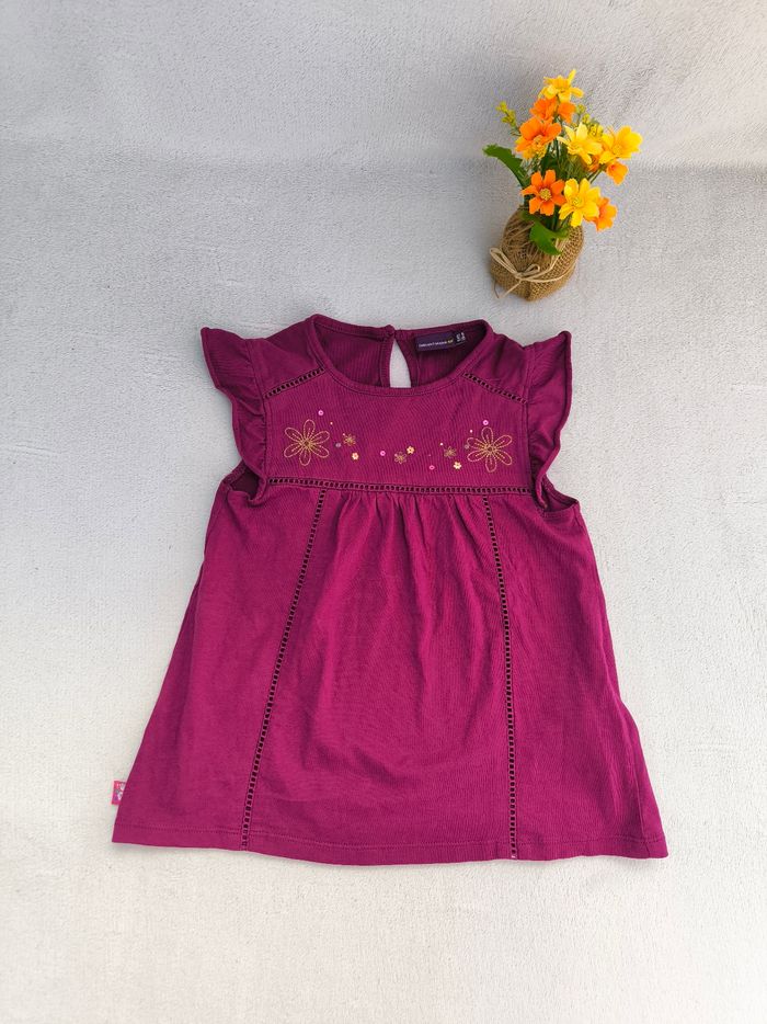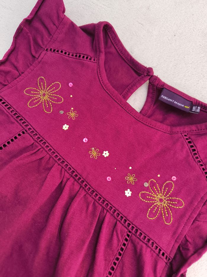 T-shirt/Débardeur/Blouse sans manches Marque Sergent Major Taille 6 ans, 116 cm • Coloris violet • Broderies fleurs, sequins • Broderies ajourées • Goutte au dos, manches volantées, fronces • Coton fin Peu porté, en très bon état #evelyne_filles_6ans #evelyne_filles