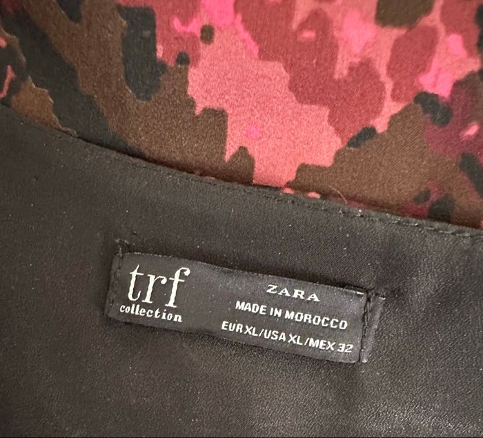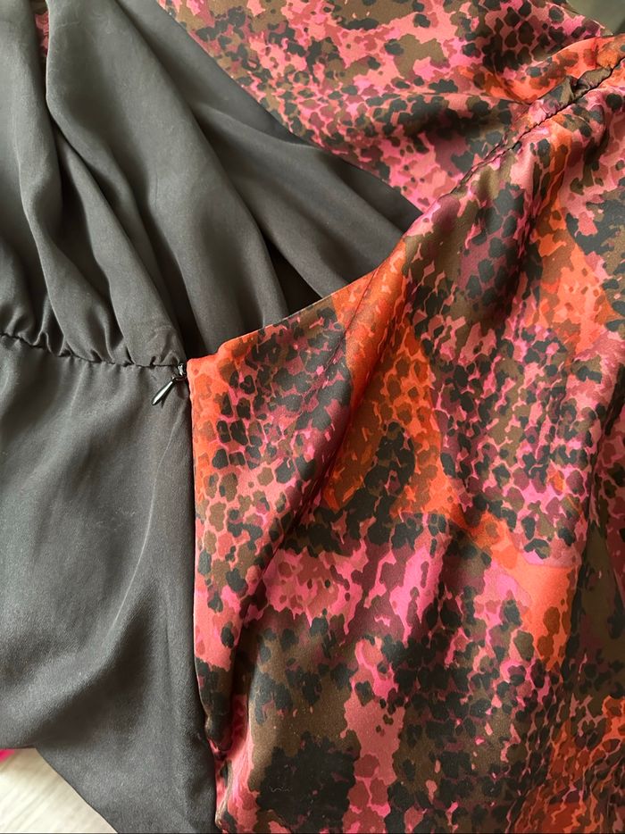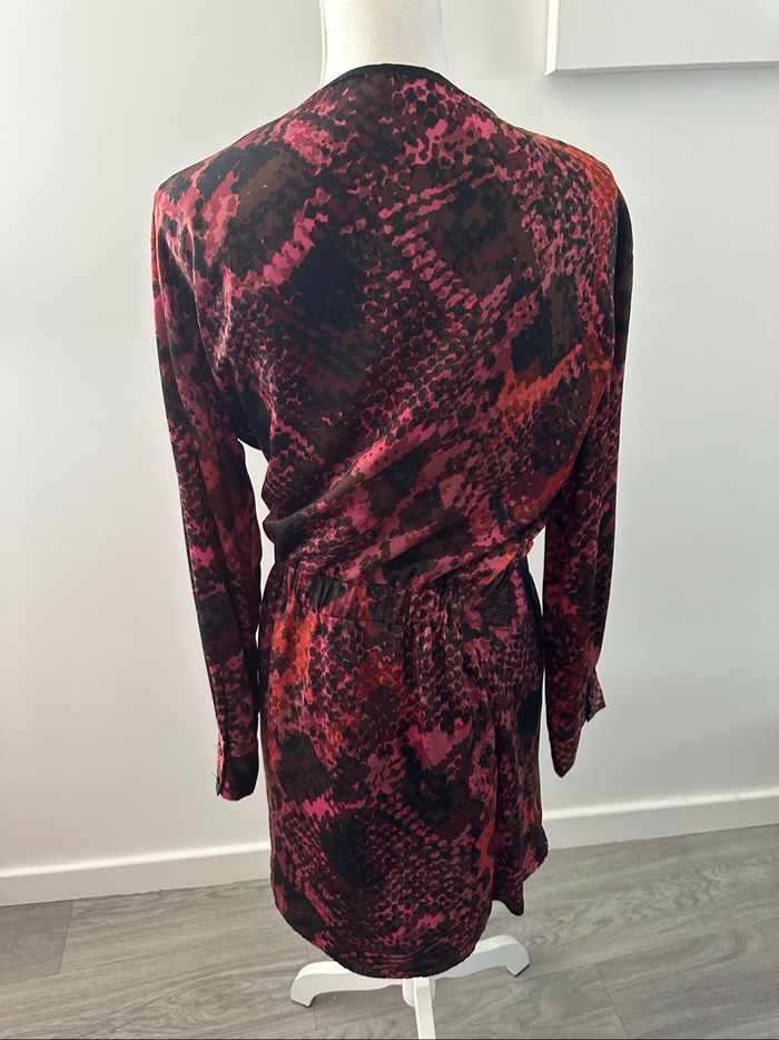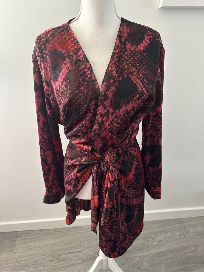 Robe - Excellent état - Taille 42 équivalent XL - Marque Zara - Cache cœur, lien à nouer à la taille - Imprimés python serpent - Bordeaux rouge et noir - Zip intérieur au niveau de la taille - Doublure intérieure - Tissus satiné - 100% Polyester Dimensions: - 60cm niveau aisselles - 94cm de long Elle est mal mise sur le portant à cause du zip intérieur