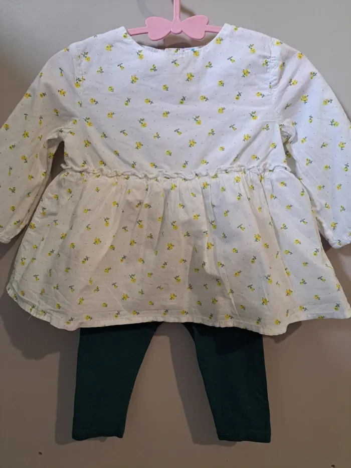 Jolie ensemble pour l'été indien composé : - 1 leggings Obaibi vert foncé , 6 mois 68cm. - 1 blouse entièrement doublée manches longues , fleurie; Tex en 6 mois. Parfait état, ni défaut ni tache Lavé et repassé Maison non fumeur, pas d'animaux Les réductions sur les lots sont actives :)