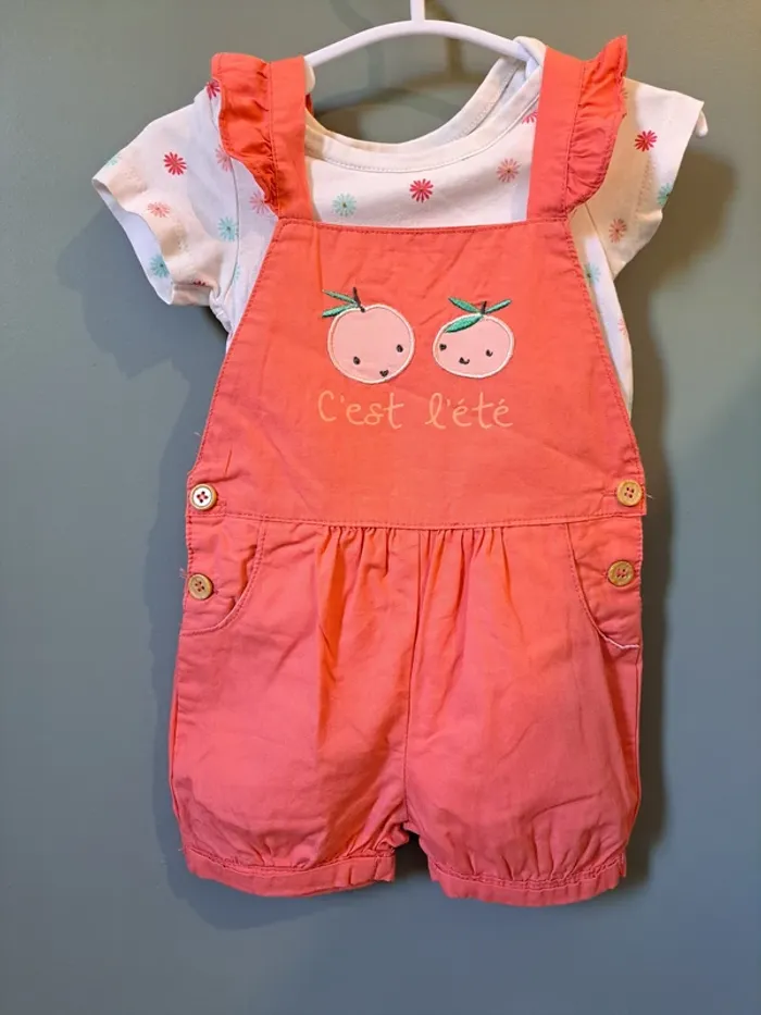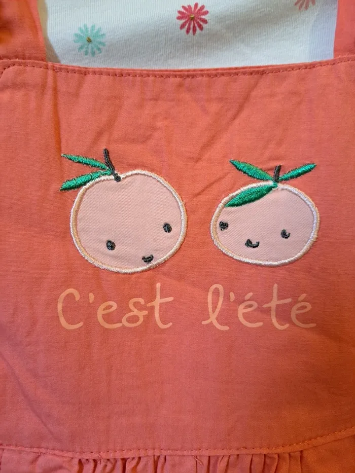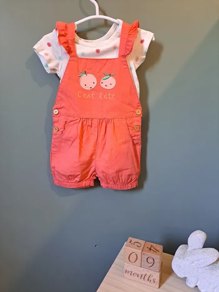 Ensemble comprenant : - 1 salopette short orange pale de la marque "Mots d'enfants" en 9 mois - 1 body manches courtes de la marque Orchestra en 9 mois 71 cm Parfait état, ni défaut ni tache Lavés et repassés Maison non fumeur, pas d'animaux Les réductions sur les lots sont actives :)