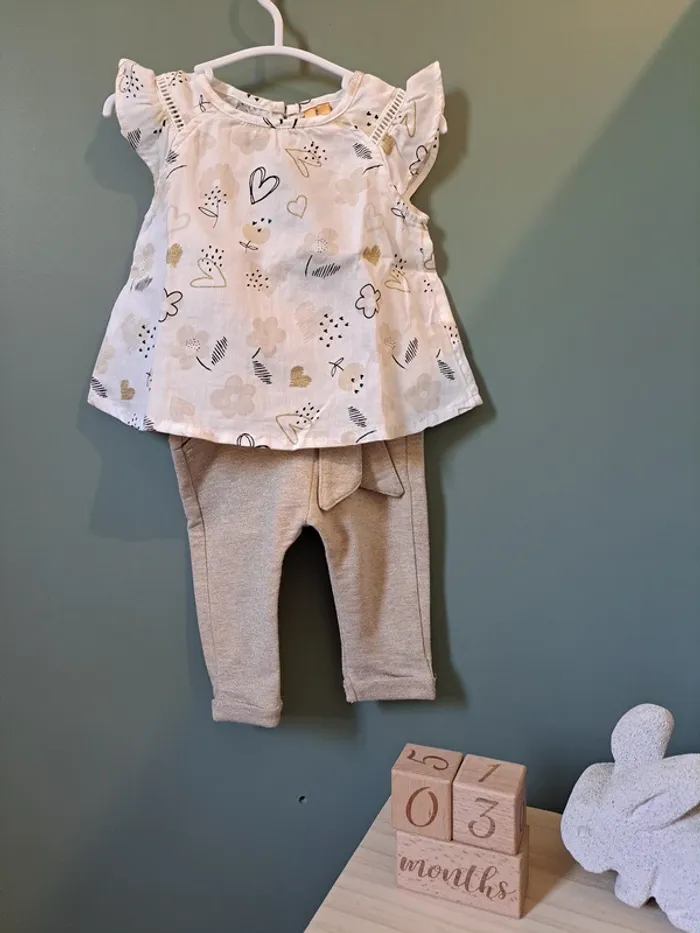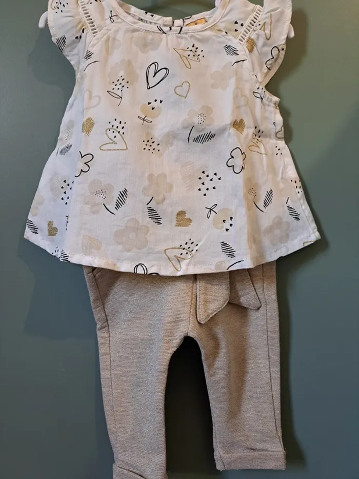 Un bel ensemble , lumineux , comprenant : - 1 blouse Orchestra de la collection Premium en 3 mois l'étiquette indique 3 mois 60 cm. - 1 leggings Luckykid en 3 mois, doré pailleté Parfait état, ni défaut ni tache Lavés et repassés Maison non fumeur, pas d'animaux Les réductions sur les lots sont actives :)