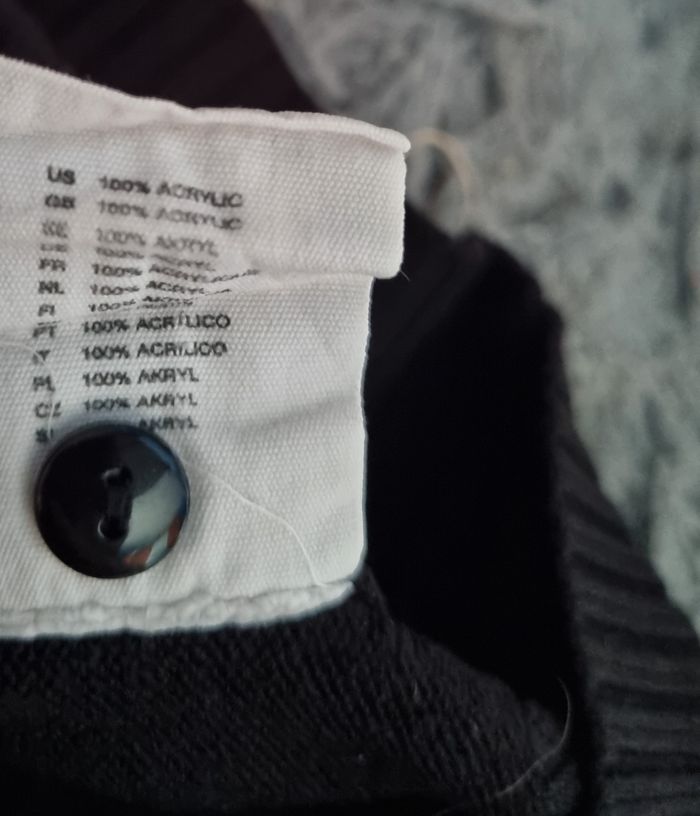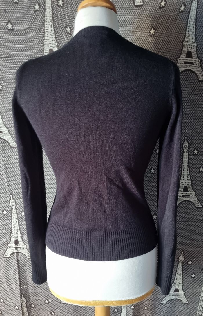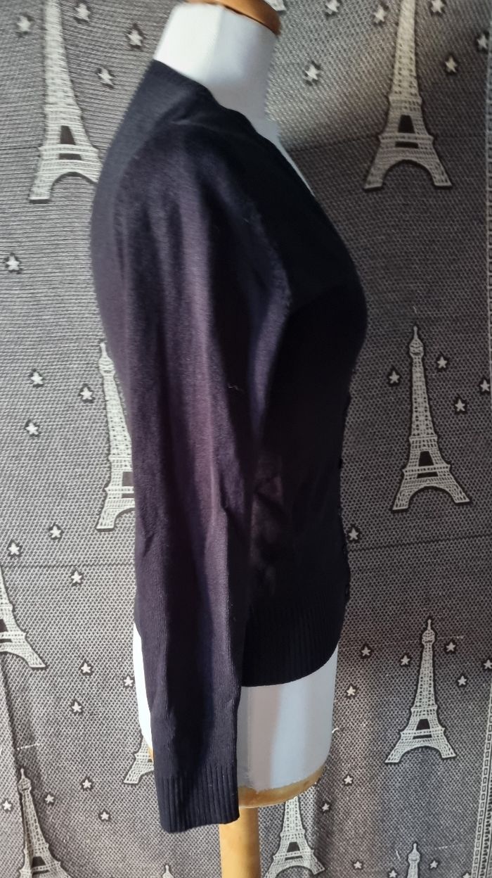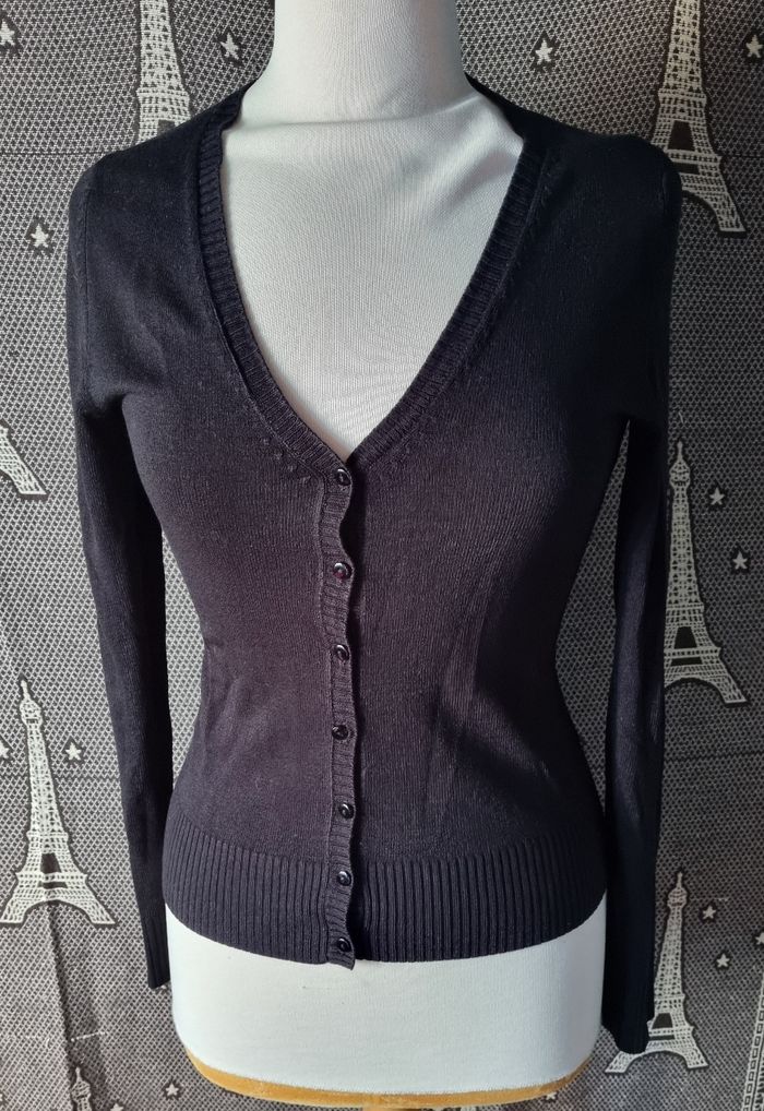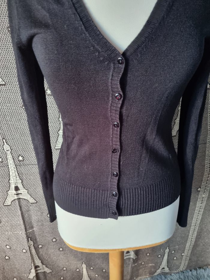 Gilet noir à boutons, taille S marque H&M, longueur 55cm, largeur 35cm, longueur épaule à aisselle 20cm, largeur aisselle à aisselle 40cm, longueur manche 50cm.