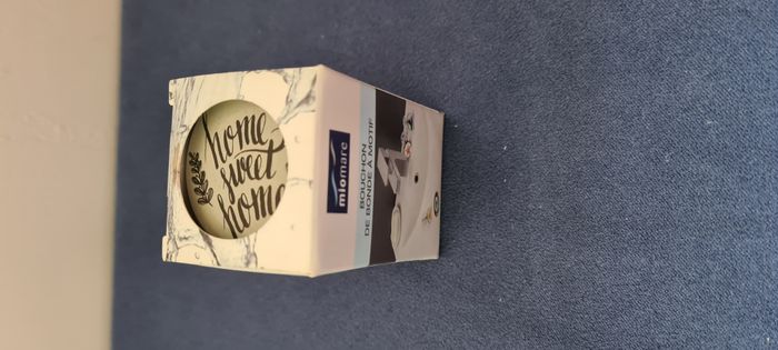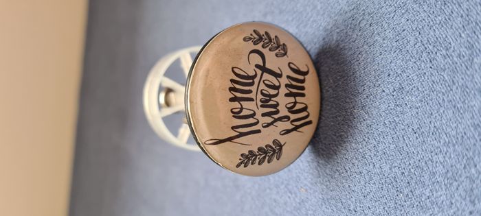 Bouchon de bonde décoré avec un motif de feuilles et le message "Home sweet home". Hauteur ajustable de 6.4 à 7.4 cm. Pour évacuation d'1 diamètre intérieur d'environ 4 cm. La partie plastique avec les ailettes sert de "filtre", permet de retenir une majorité de cheveux, pour éviter d'encombrer les canalisations. Neuf jamais utilisé, trouvé un peu après l'achat un modèle qui correspondait encore mieux au style de la salle de bain. Celui ci est donc resté de côté. #bouchondebonde #bouchonlavabo #bouchondécoré #accessoiresalledebain #mar-taybricolage #mar-taydeco