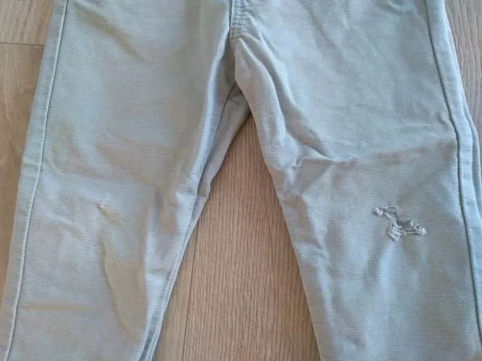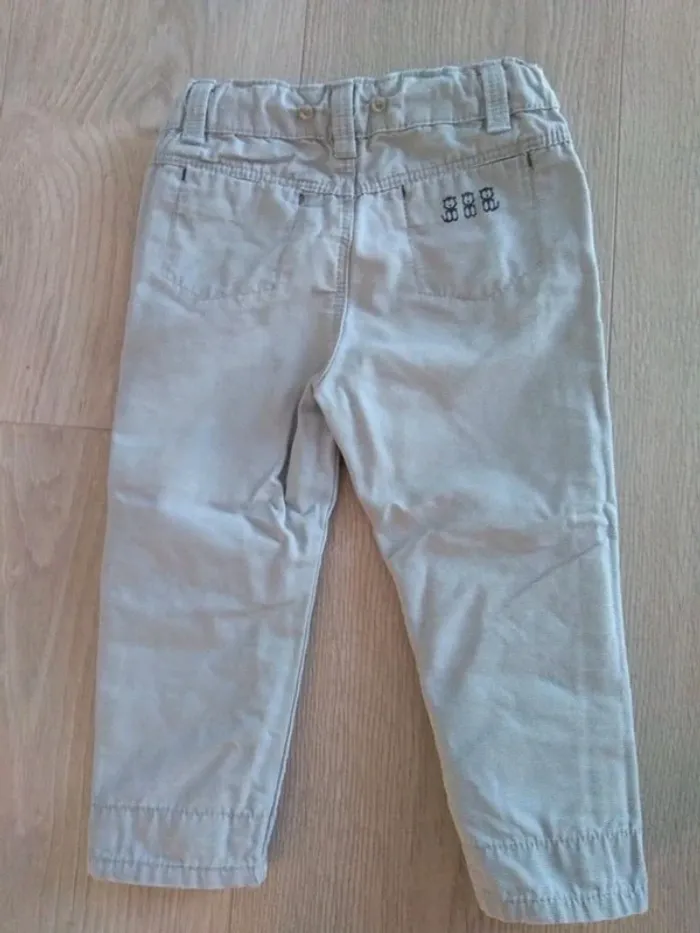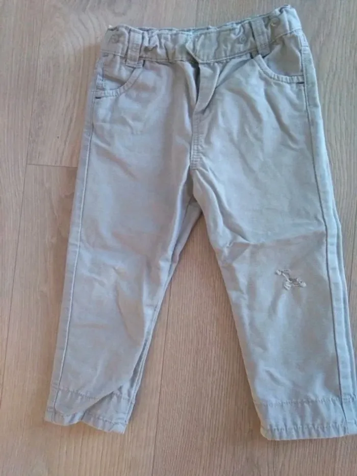 Pantalon gris clair Obaïbi avec boutons au niveau de la taille pour bretelles assorties Les bretelles sont en parfait état. Le pantalon est troué au niveau des genoux (voir photo 4) #lolamalo50bebegarçon18mois