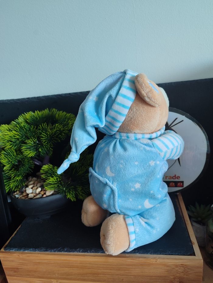 peluche ours bonnet nuit bleu marron beige étoile rayé blanc lune à genou prière - photo numéro 1