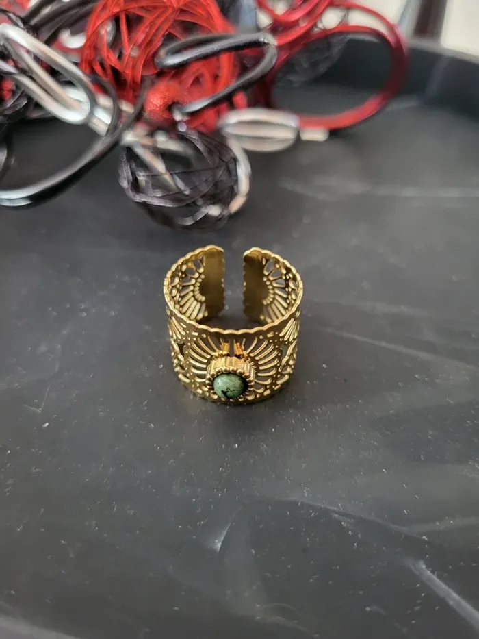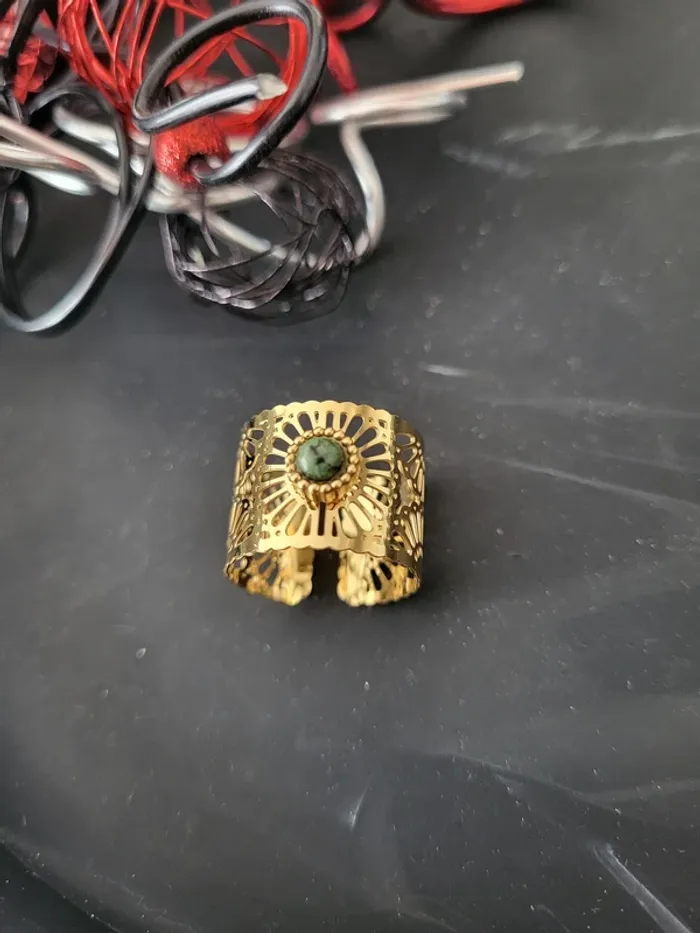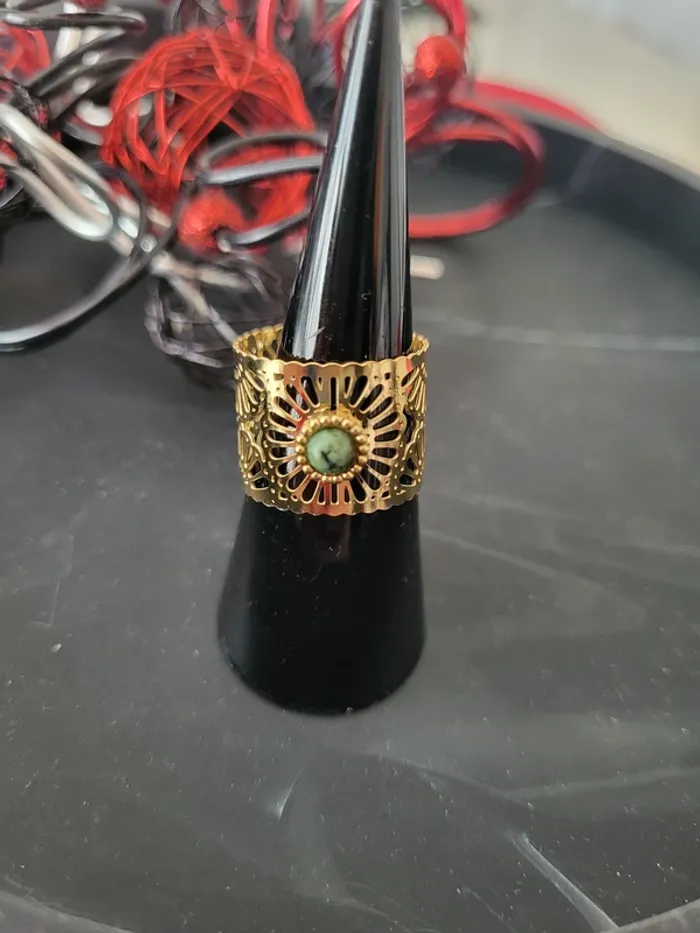 Bague ajustable acier inoxydable dorée avec pierre verte et marguerite ajourée Envoi rapide et soigné Remise sur les lots : n'hésitez pas !
