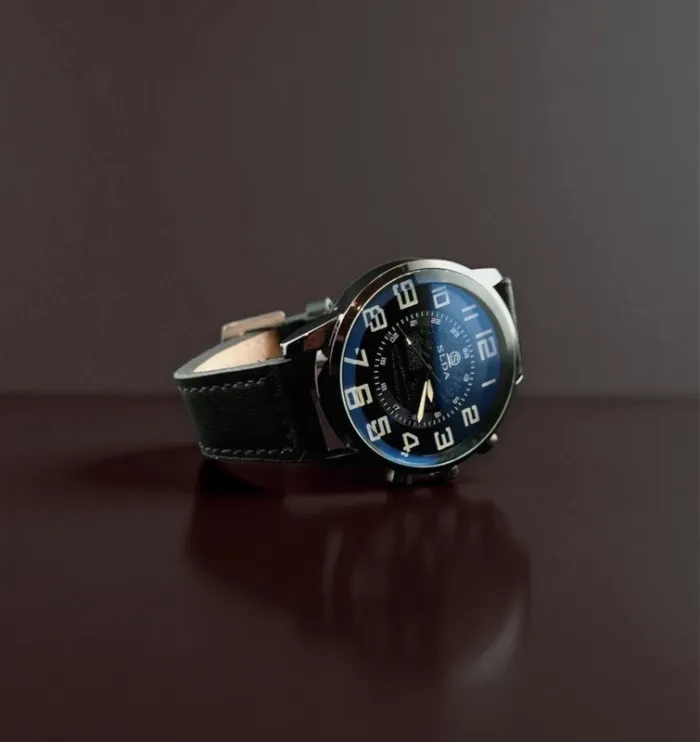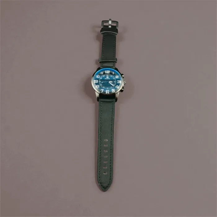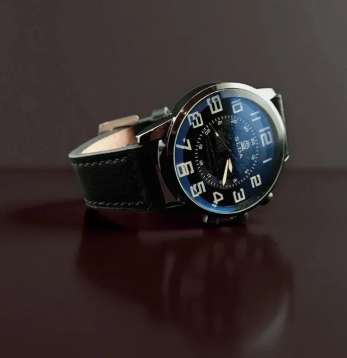 Excellent état, pile incluse. Affichage précis segmenté, reliefs et reflets bleus. Cadran large et solide. Bracelet épais simili cuir noir.