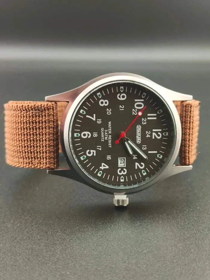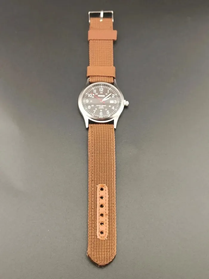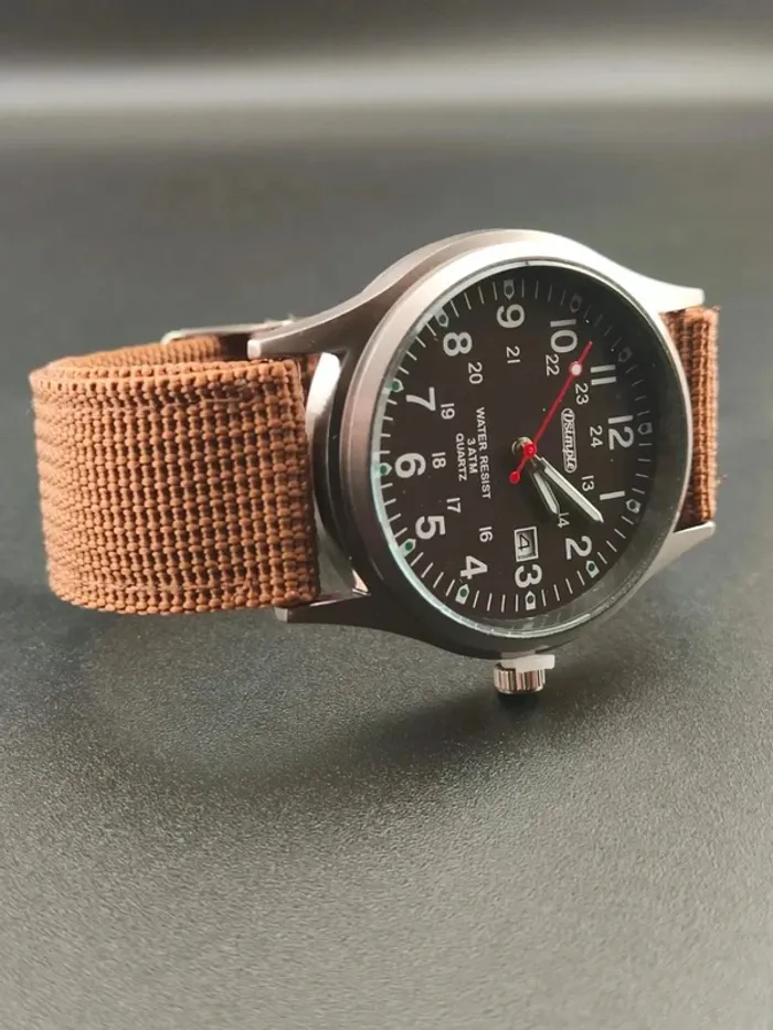 Excellent état, pile incluse. Affichage classique segmenté heure et date. Contours solides. Bracelet marron texture scratch léger.