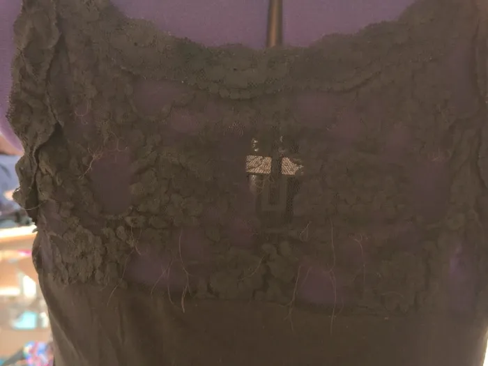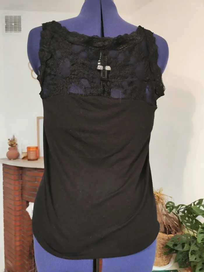 T-shirt sans manches noir M/L, Bréal. M porté ample, L porté plus moulant. D'occasion, quelques coutures défaites (voir photo) Matière : Coton.