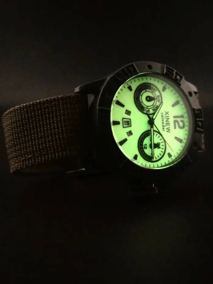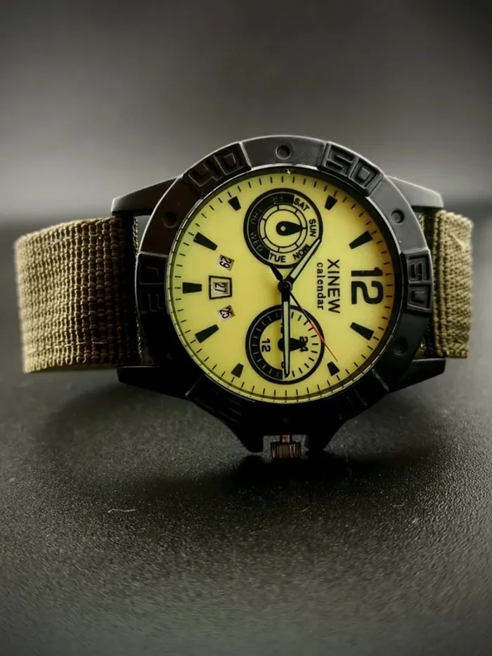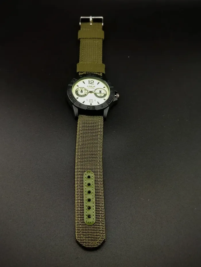 Excellent état, pile incluse. Cadran et aiguilles phosphorescentes. (Voir photo 2.) Affichage heure et date. Cadran centraux décoratifs. Contours noirs solides. Bracelet nylon vert élégant, léger, réglable.