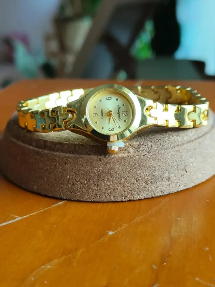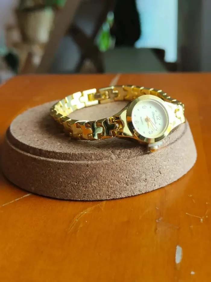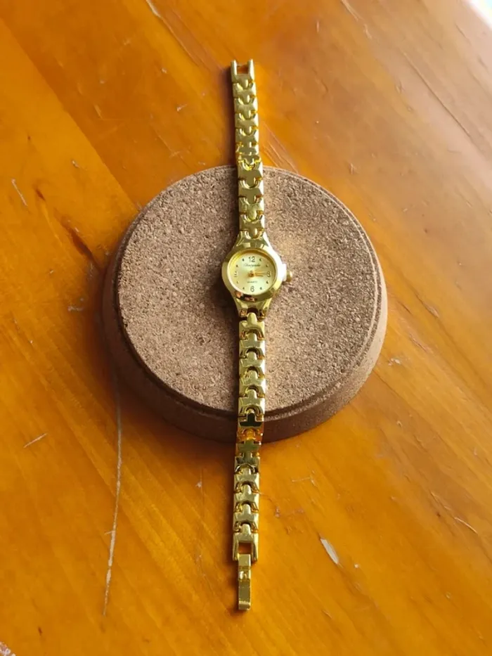 Excellent état, pile incluse. Affichage classique cadran rond doré. Bracelet alliage doré, fermeture clip.