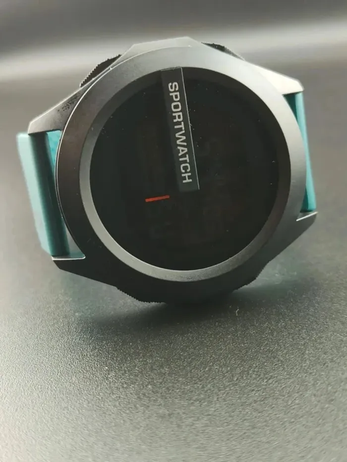 Excellent état, pile incluse. Affichage date, chronomètre, heure, alarme. Lumière de nuit turquoise. Contours noirs solides, waterproof 3 ATM. Bracelet silicone bleu résistant. Notice incluse.
