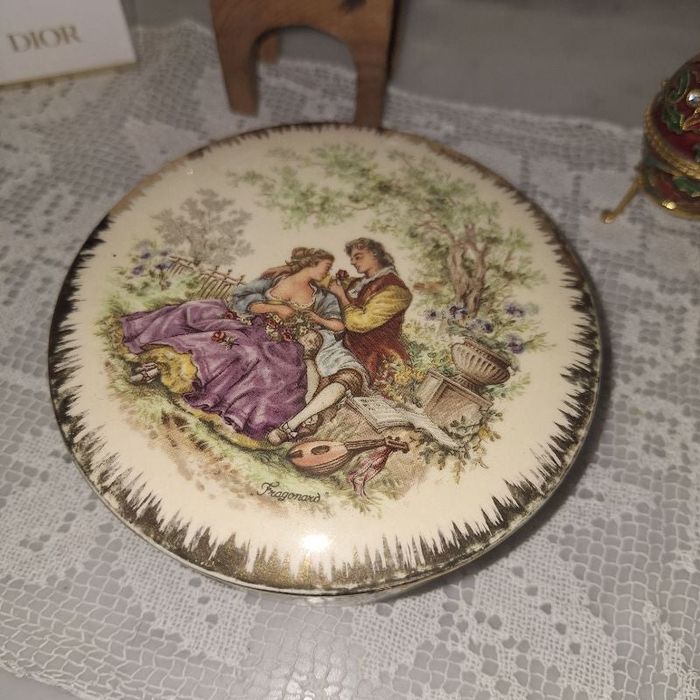 1 éclat sur le côté voir photo mais au final peu visible dans l ensemble Diamètre 13 cm Porcelaine faïence d art fait en France Peut servir de coffre à bijoux Liseré doré Shabby Consulter mes autres annonces pour composer des lots et faire des économies