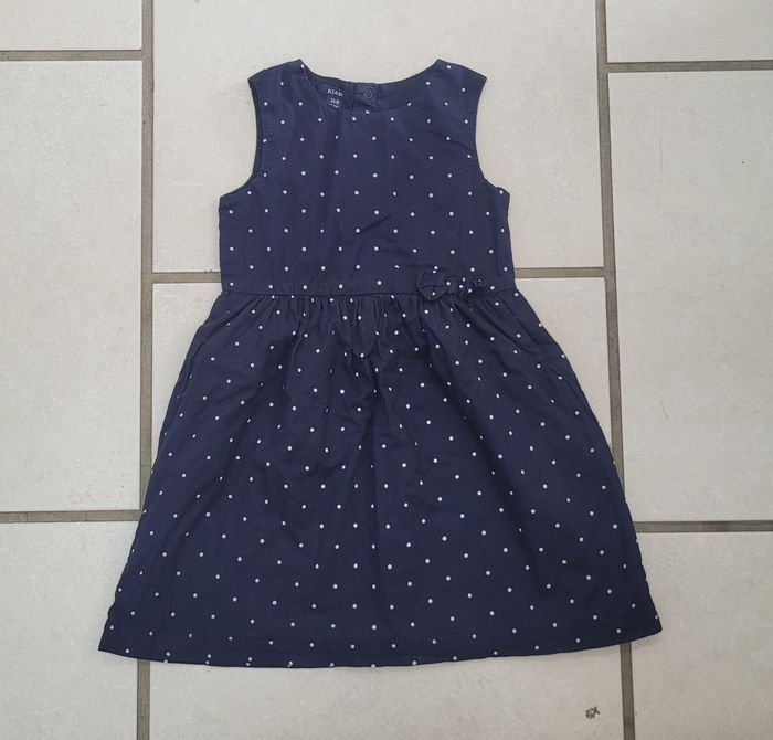 Robe à pois de couleur marine, de la marque Kiabi, taille 36 mois (94 cm), en très bon état. Article lavé pour la vente.