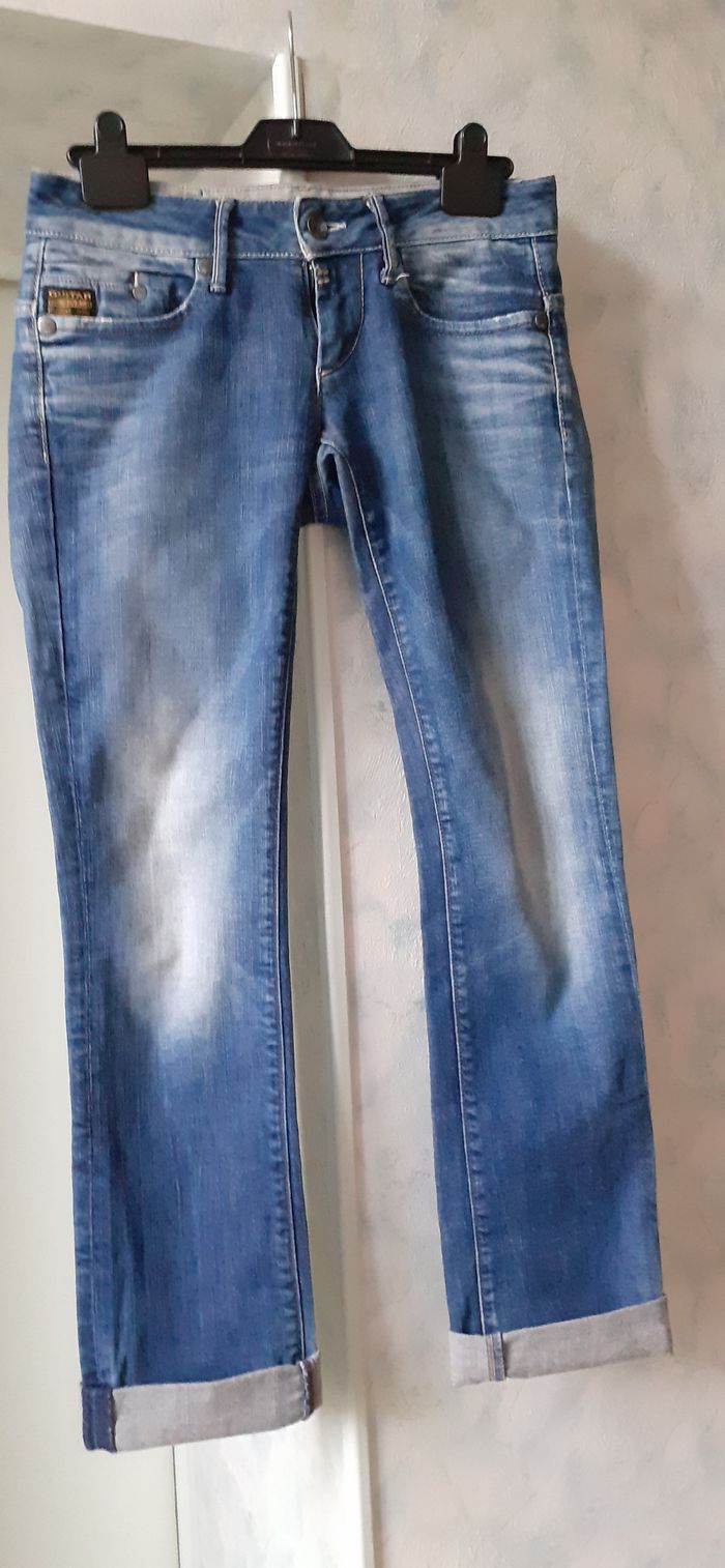 Vends un jean taille basse, à porter avec ou sans revers, patte avec boutons dans le dos pour régler la ceinture, couleur bleu, délavé au niveau des genoux, marque G-STAR, taille S. Longueur entrejambe : 71 cm avec le revers, 80 cm sans le revers Largeur de la ceinture à plat : 37 cm Largeur au niveau des hanches : 47 cm.