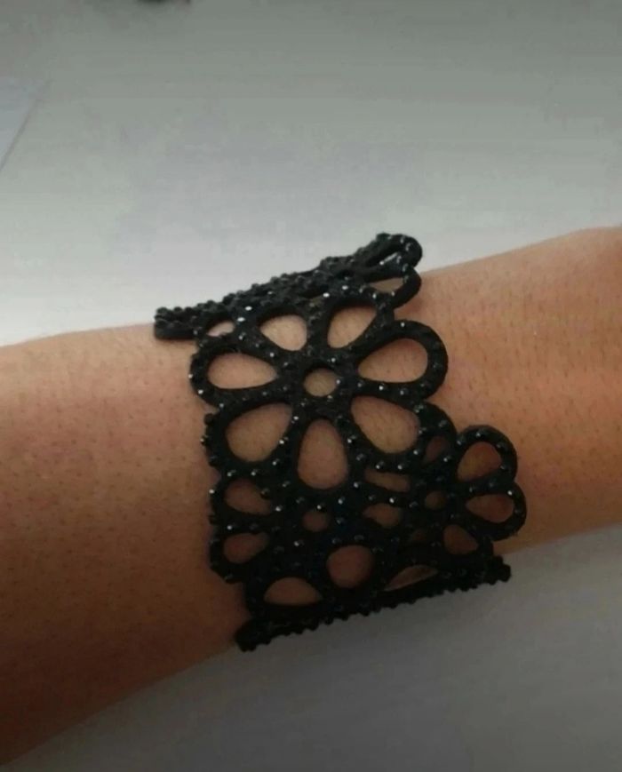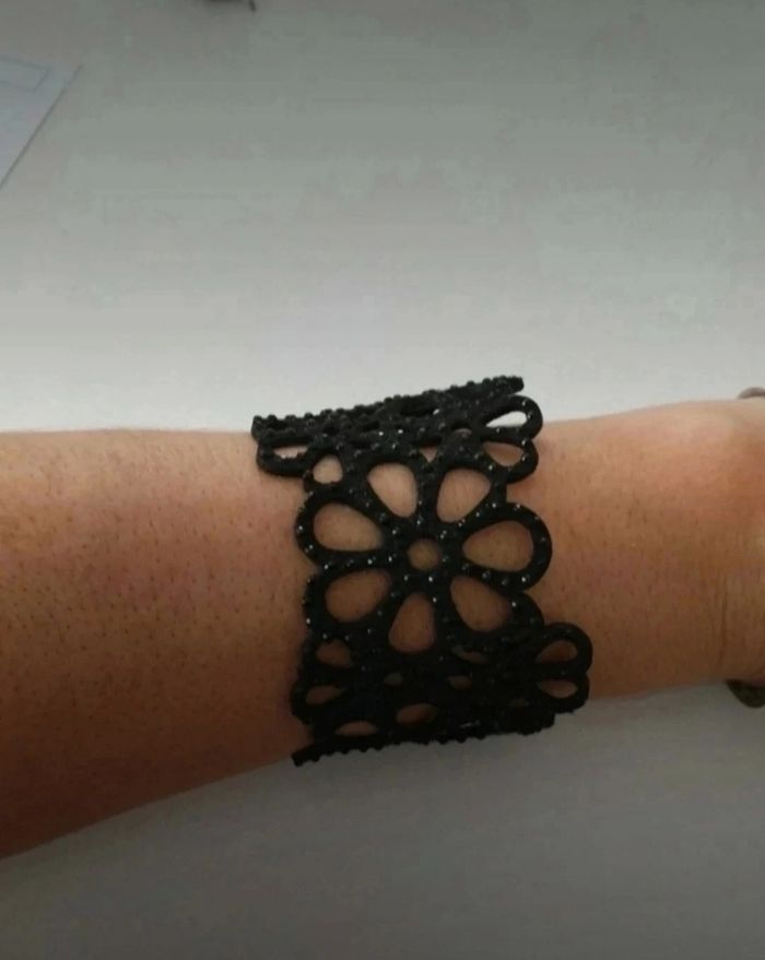 Je vends ce bracelet manchette noir en dentelle ajourée. - Type de produit : Bracelet - Univers : Femme - Matière : Autre - Style : Dentelle ajourée - Couleur : Noir Très bon état. N'hésitez pas à me contacter pour plus d'informations !