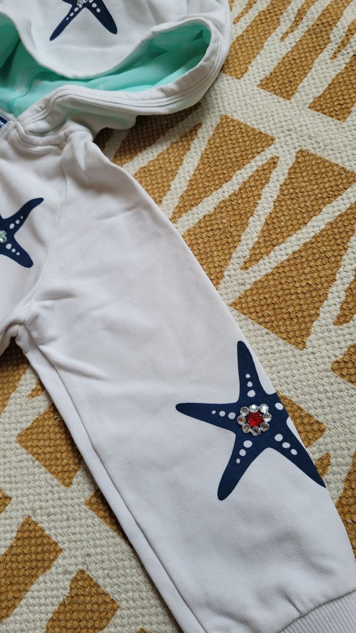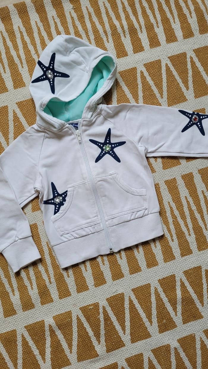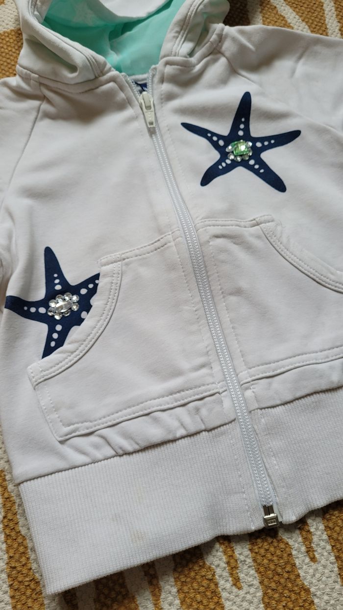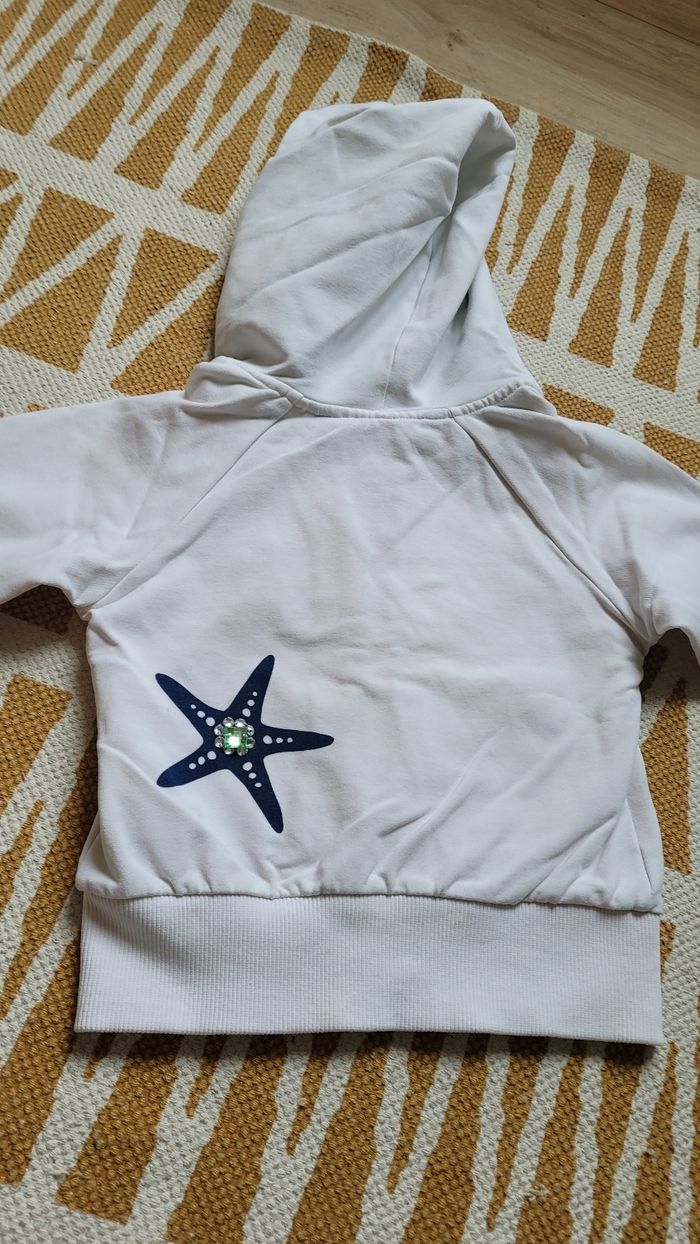 Gilet blanc à capuche, zippé. Avec étoiles de mer 🌊 tâches à revoir dans l'élastique en bas. 3ans.