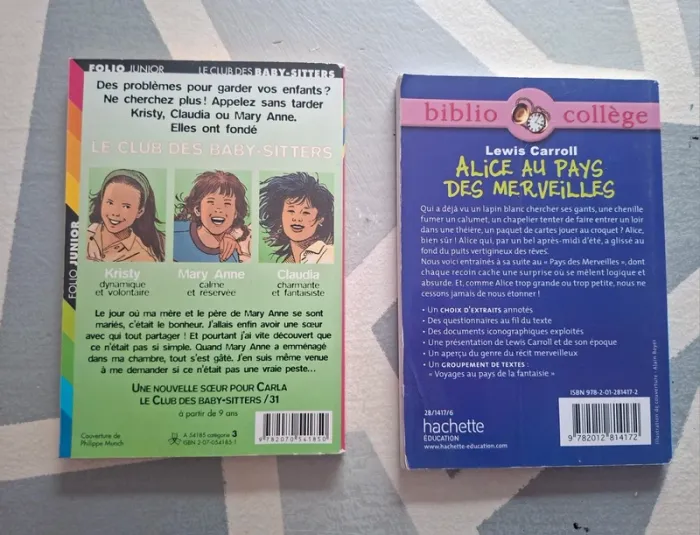 Une nouvelle sœur pour Carla – Ann M. Martin (Le Club des Baby-Sitters, Folio Junior) Alice au pays des merveilles – Lewis Carroll (Biblio Collège, Hachette Éducation) 👉 Très bon état, comme neufs. 💰 Prix : 5€ les 2