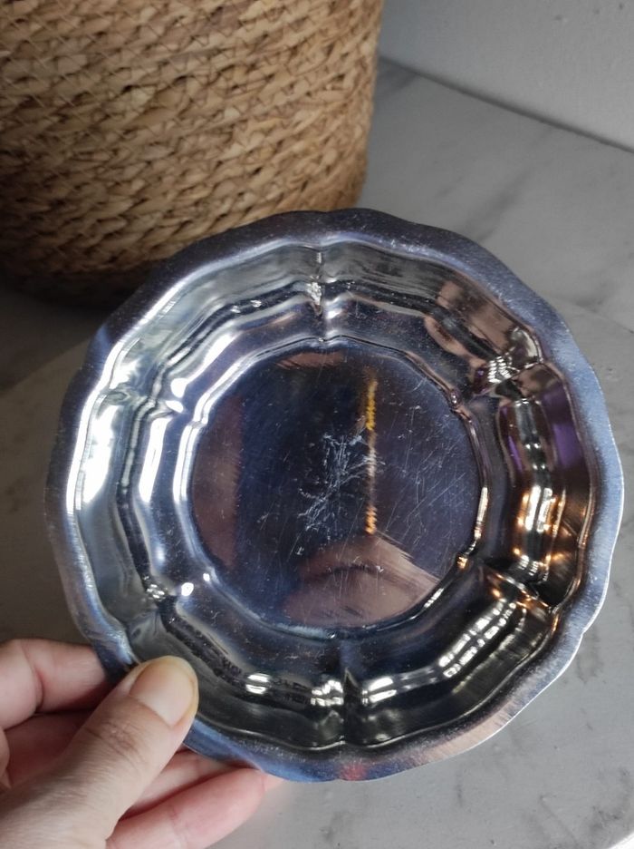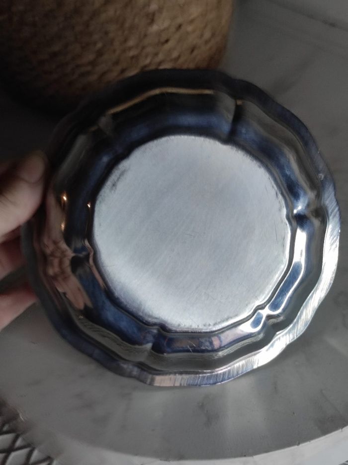 Petite coupelle en inox comportant plusieurs rayures d'usage du temps ( a servis durant longtemps de vide poche ). Dimensions H 3,5 x D 14 cm