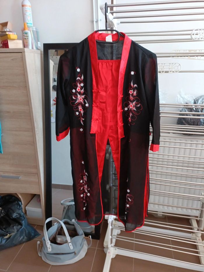 2 Tenues chinoises. 1 robe avec petit chapeau. 1 tunique chinoise avec pantalon. Bon état.