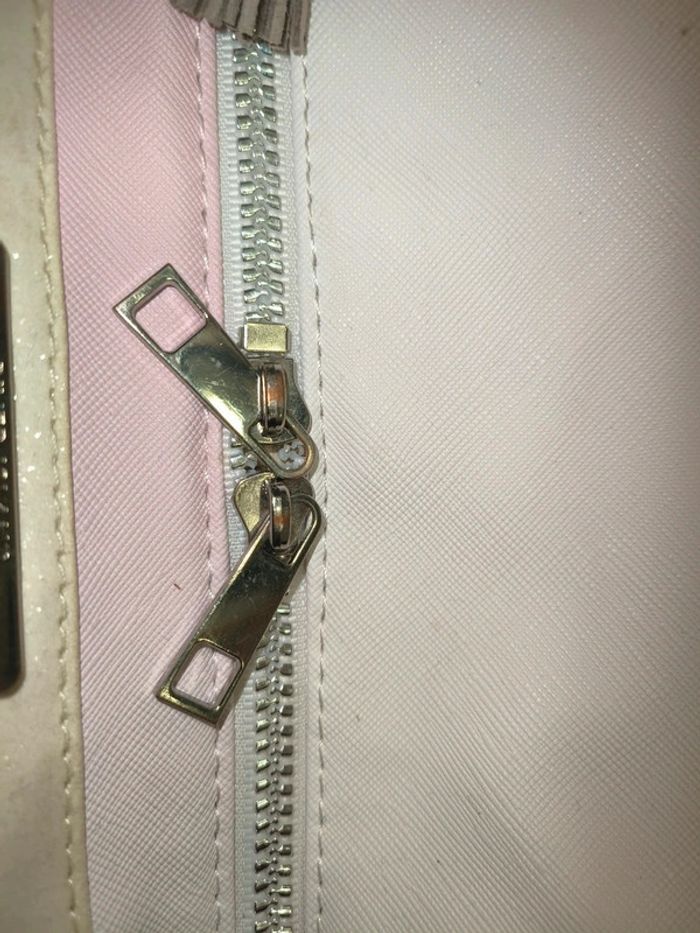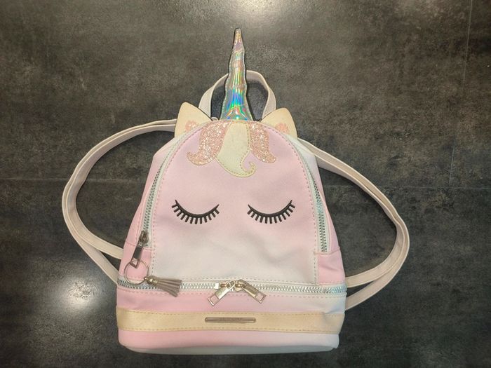 Sac a dos cartable fille maternelle sac à goûter river island licorne rose blanc holographique, la corne est un peu pliée et un peu d'usure sur les zips
